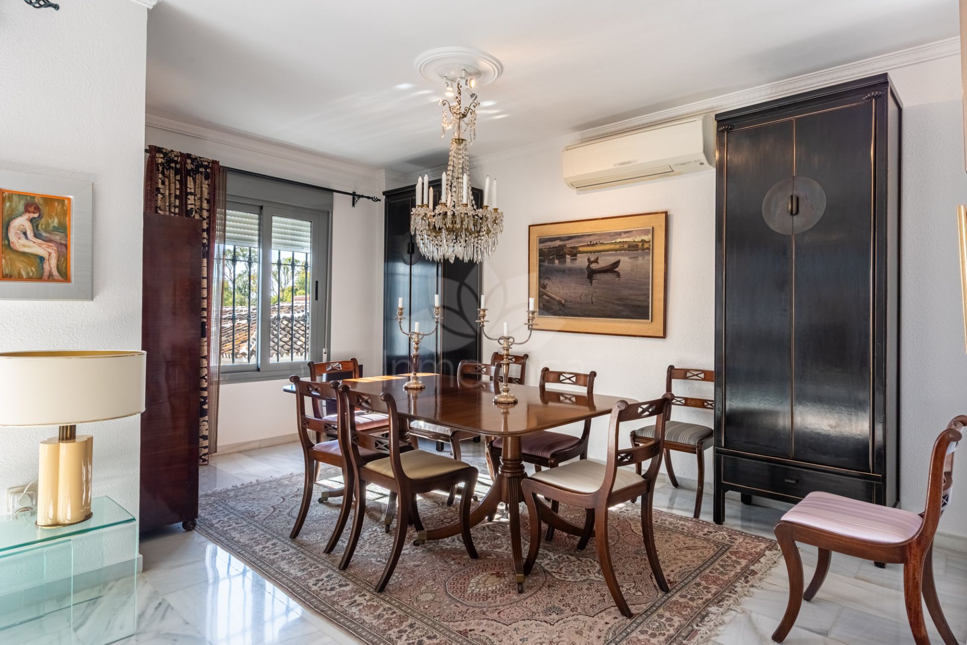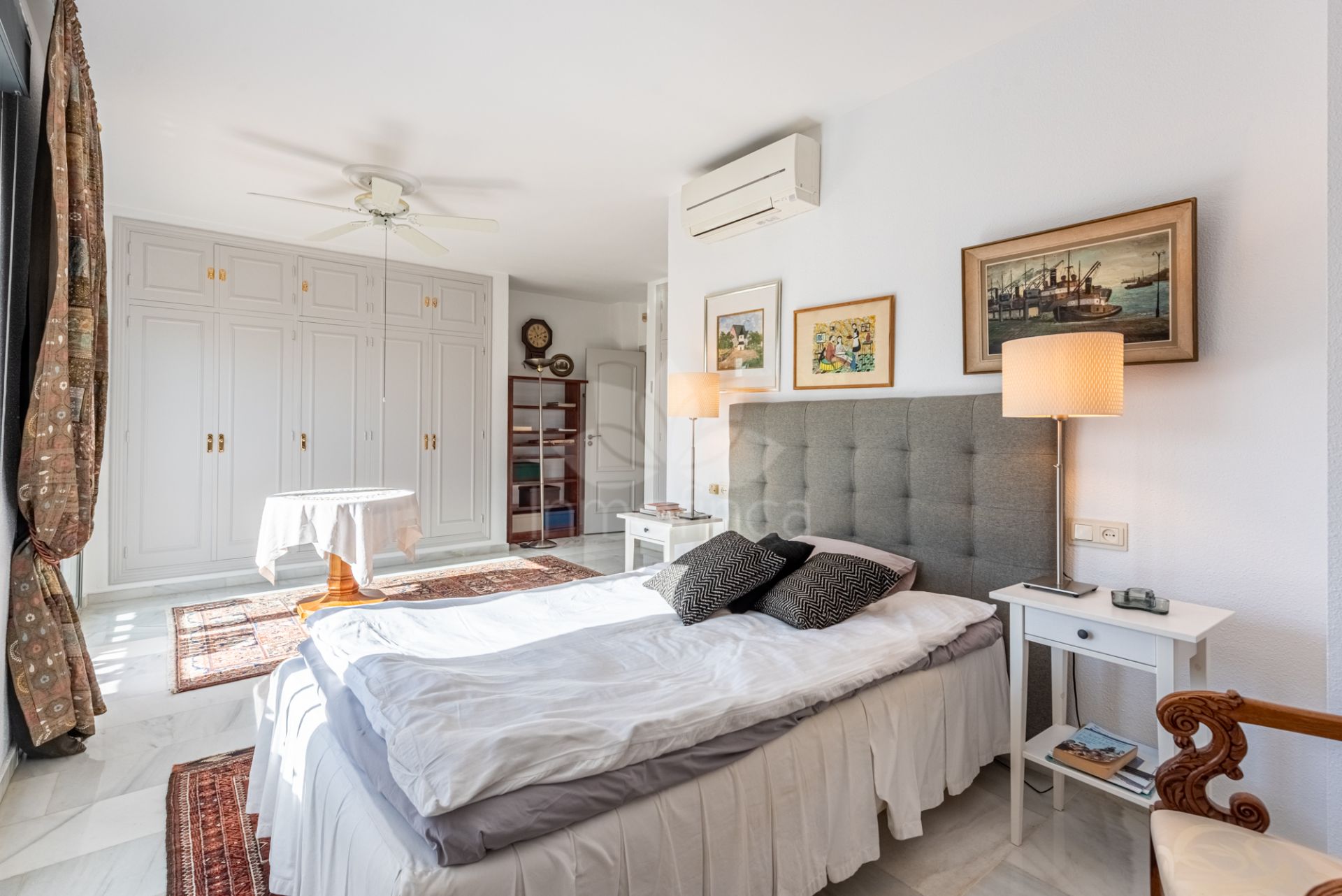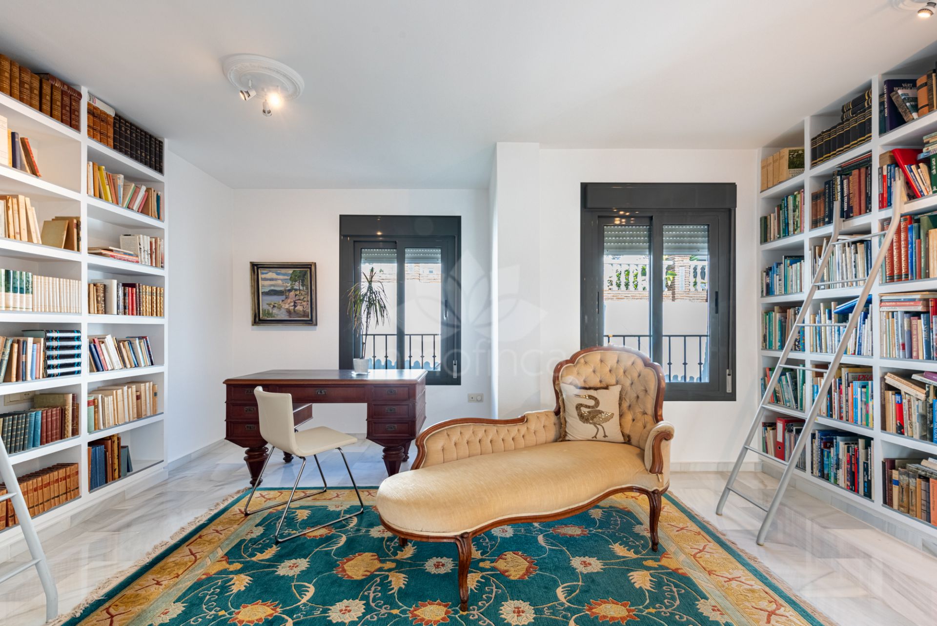A marble staircase leads to the first floor, which originally hosted four bedrooms and can easily be restored to that layout if desired. Today, it comprises a large master bedroom with an en-suite bathroom, a guest room currently used as an office, and a library that can be converted back into two bedrooms. A second bathroom is also located on this floor.