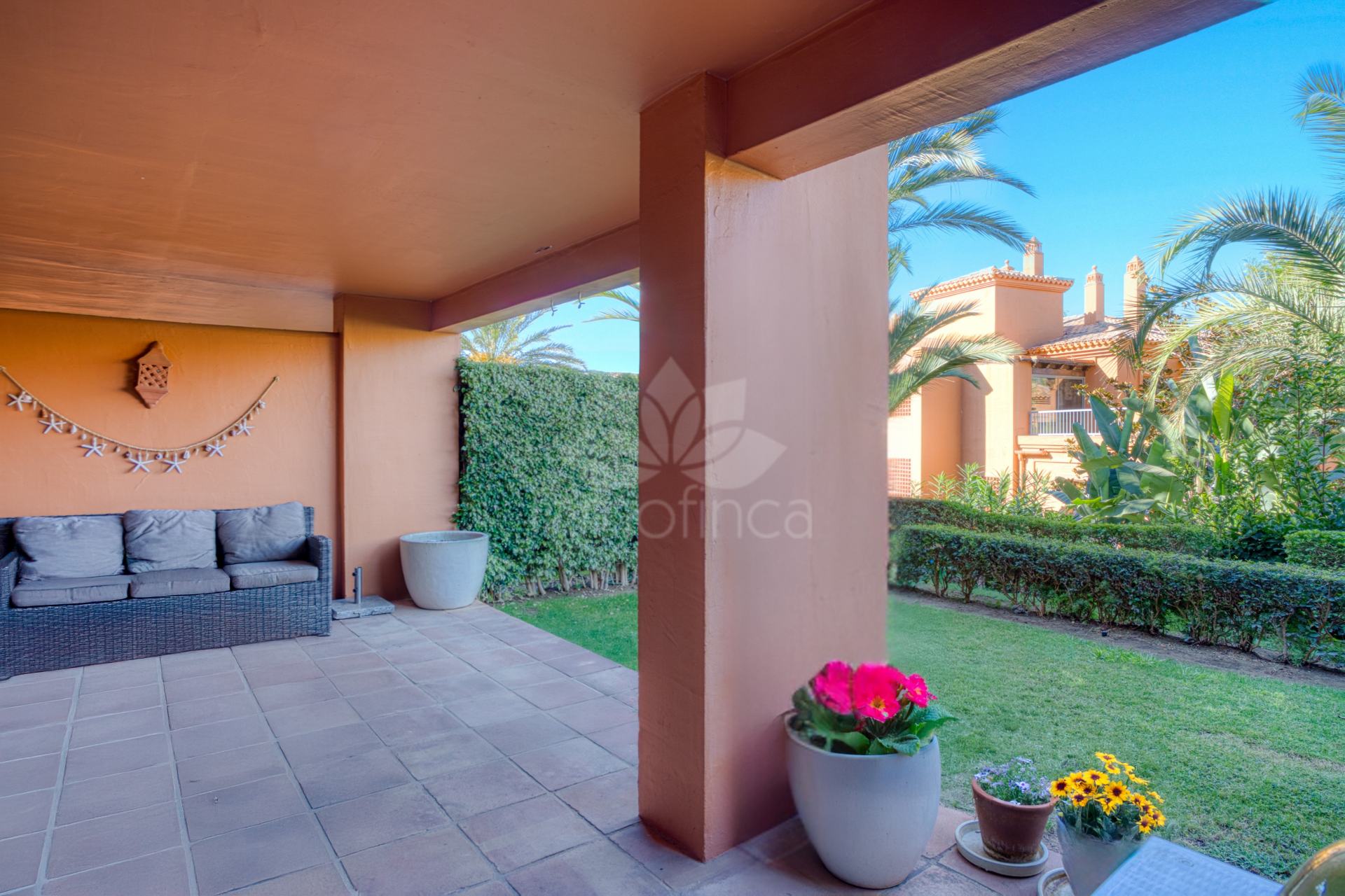 Wonderful two-bedroom, ground floor apartment located in the sought after gated community of Benatalaya, Estepona East. The community offers 24hr security, concierge, communal swimming pools, indoor heated pool, gym, sauna, hammam and is located next to local schools’ shops and a short drive to the beach. The property has an open plan living and dining room with direct access to the private terrace and garden; fully fitted kitchen; master suite with access to the terrace; guest bedroom; and guest bathroom. Other features include hot and cold air conditioning, underfloor heating in the bathrooms, electric shutters, private parking space and a storeroom. A perfect property for year-round living or holiday home.