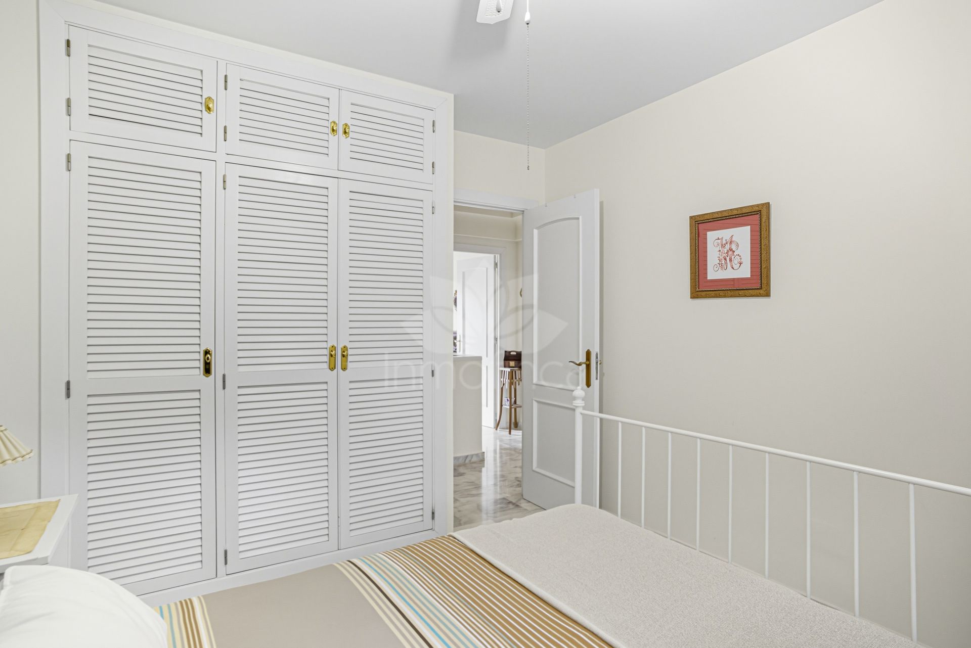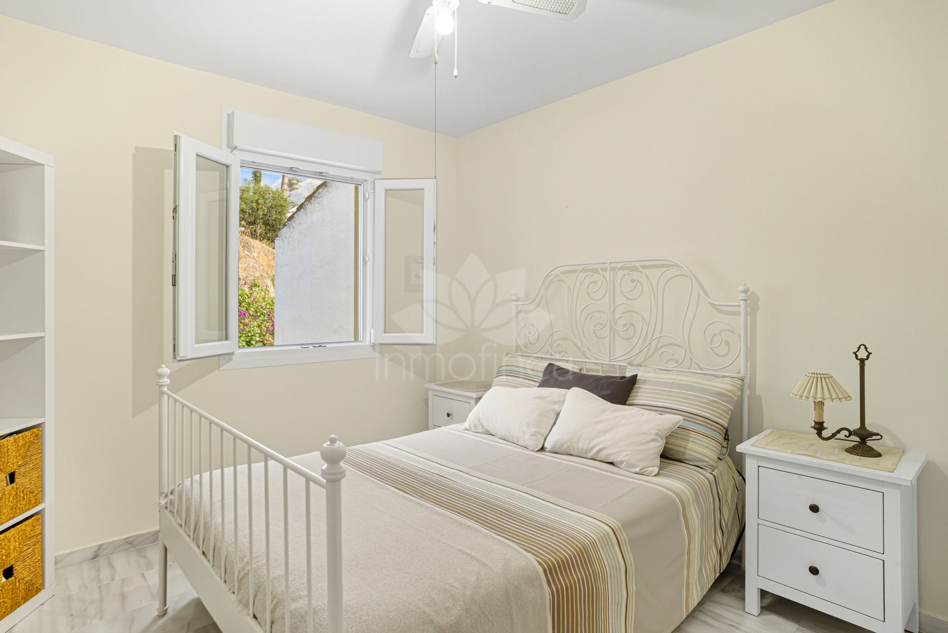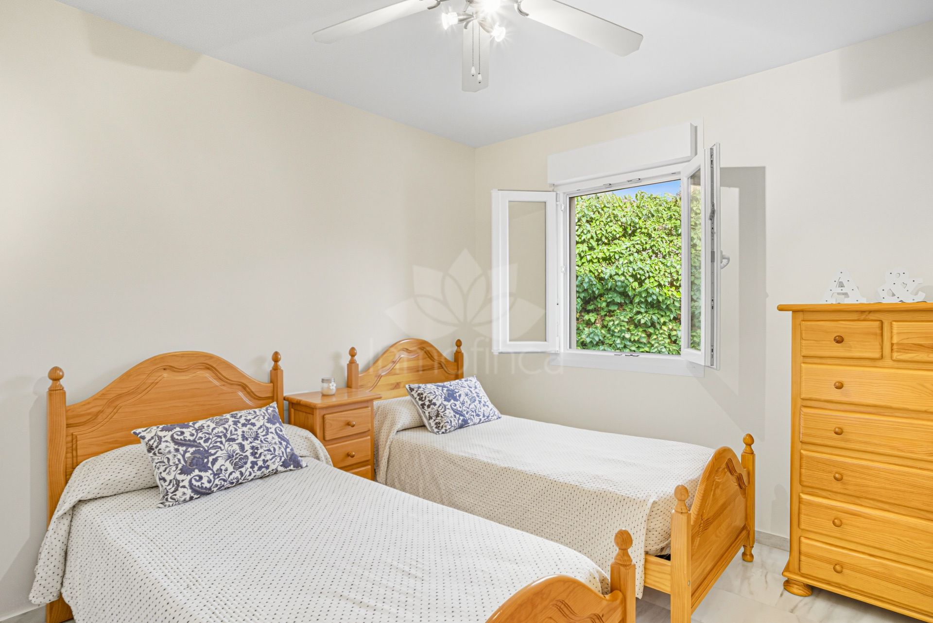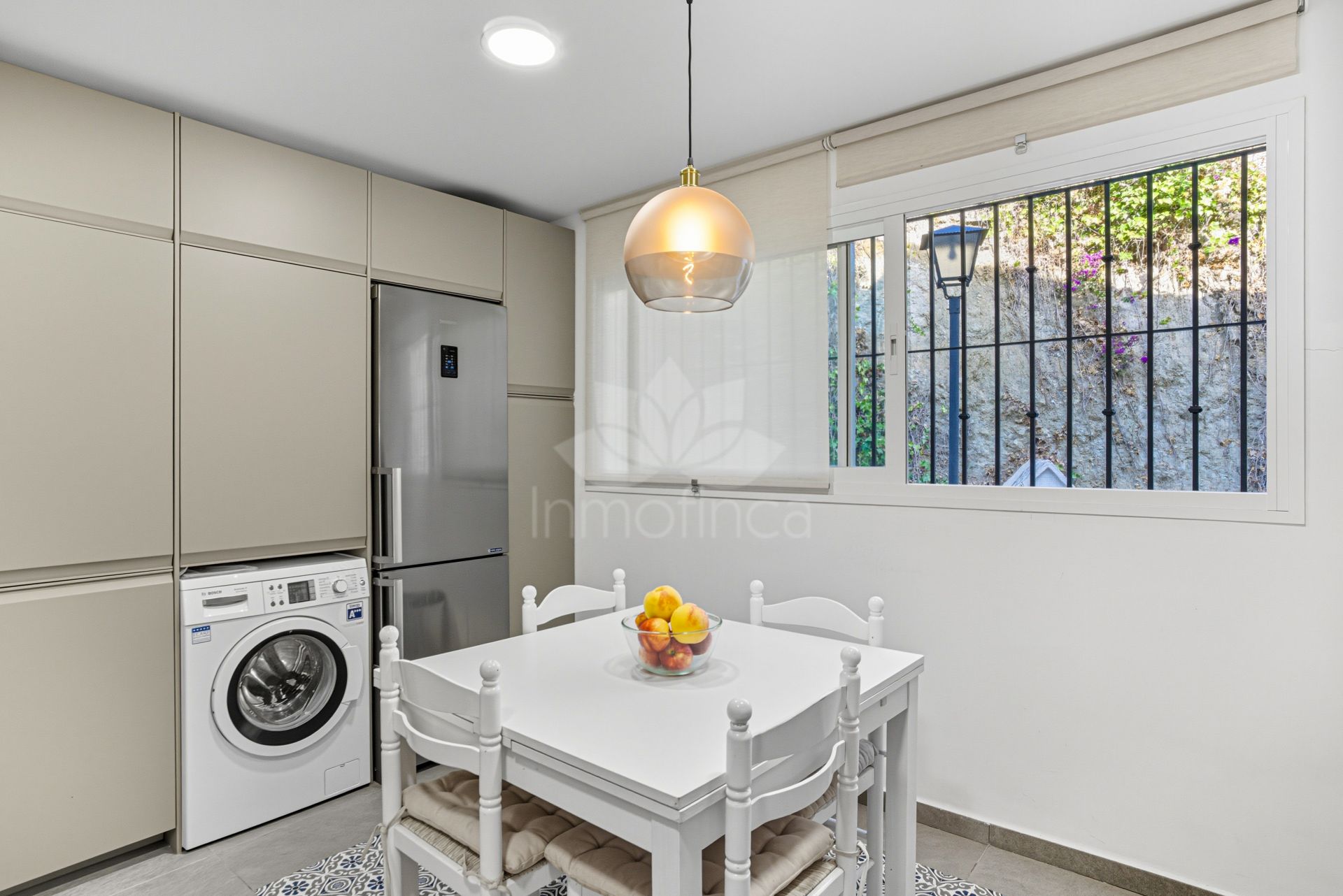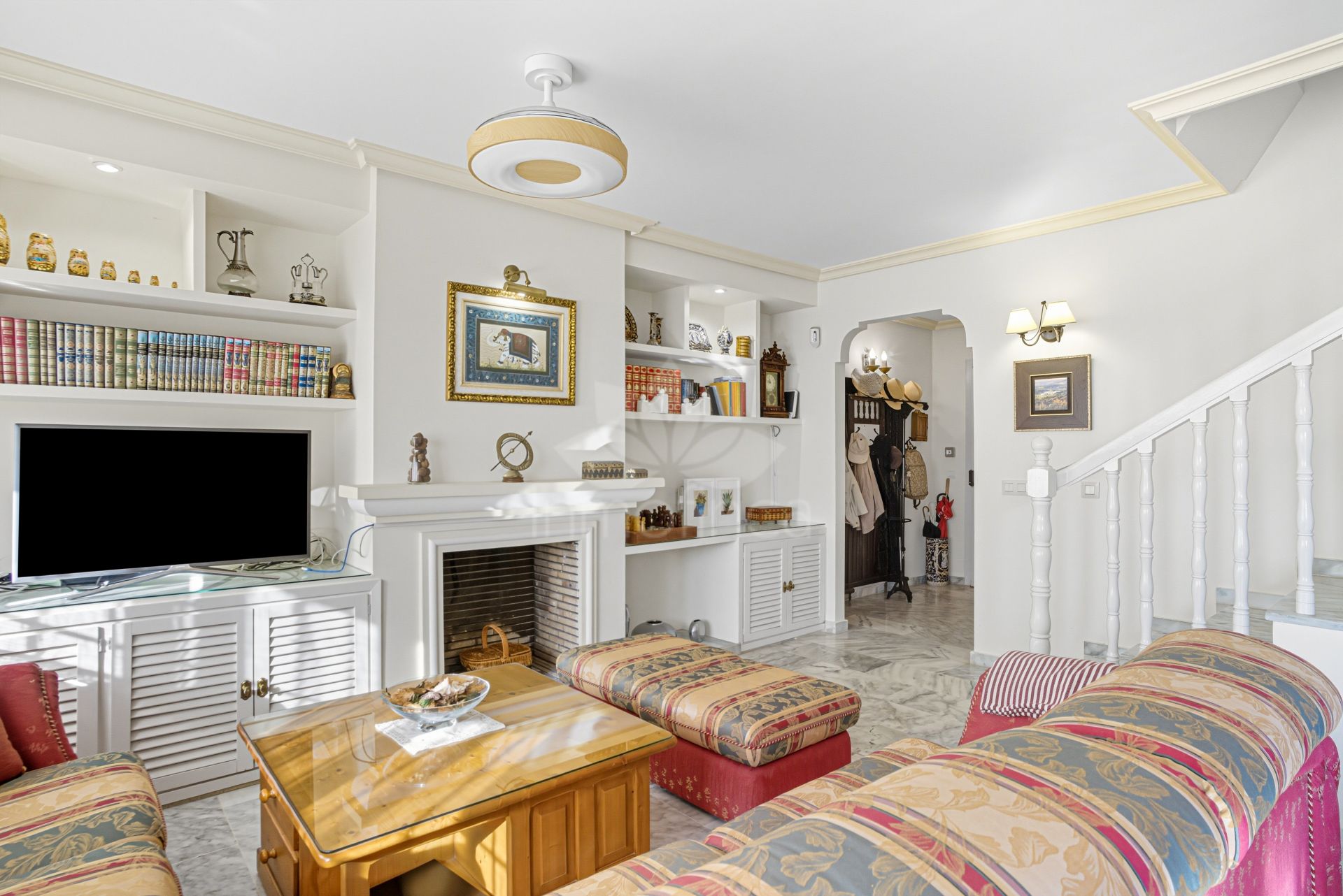 This lovely three-bedroom, south-facing townhouse is set in the sought-after gated community of El Capricho on Marbella’s Golden Mile, offering spacious tropical gardens and two communal swimming pools. Ideally located within walking distance to the beach, bars, and restaurants, and just a short drive from Marbella Center and Puerto Banús, the property combines convenience with charm. The ground floor features a bright living and dining area with a fireplace and access to a generous terrace perfect for outdoor dining, a newly renovated separate kitchen, and a guest toilet. Stairs lead down to a large basement currently used as a bedroom and art studio with its own bathroom. Upstairs, the master suite is accompanied by two guest bedrooms and a family bathroom. Additional highlights include fitted wardrobes, marble floors, and private parking for one car.