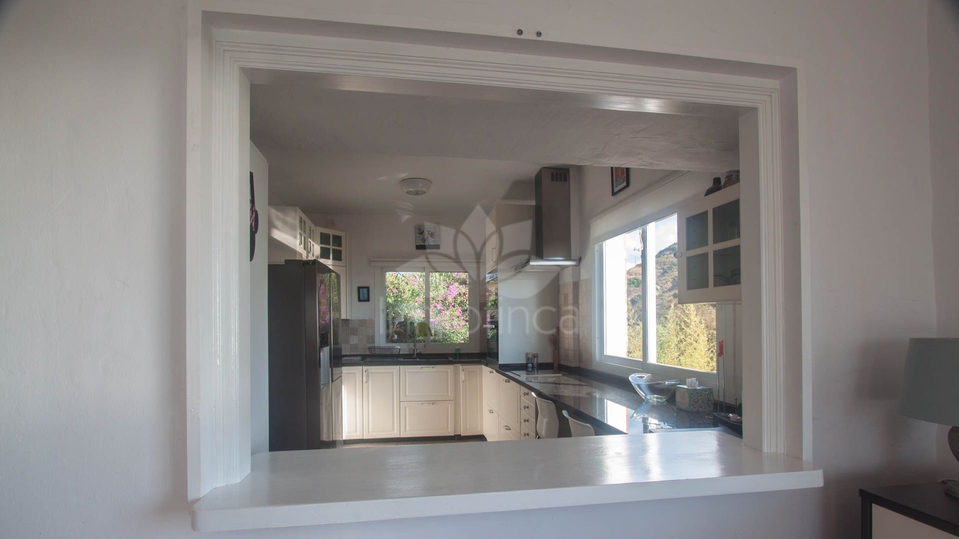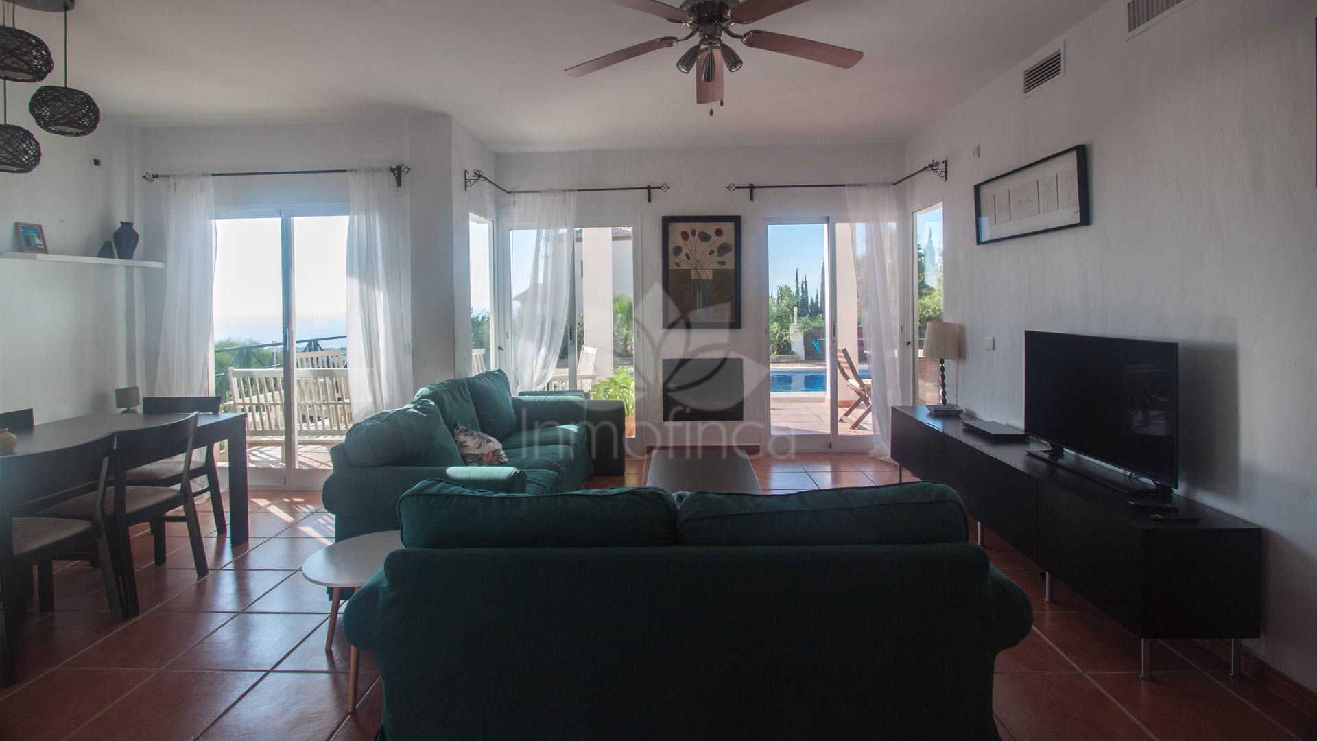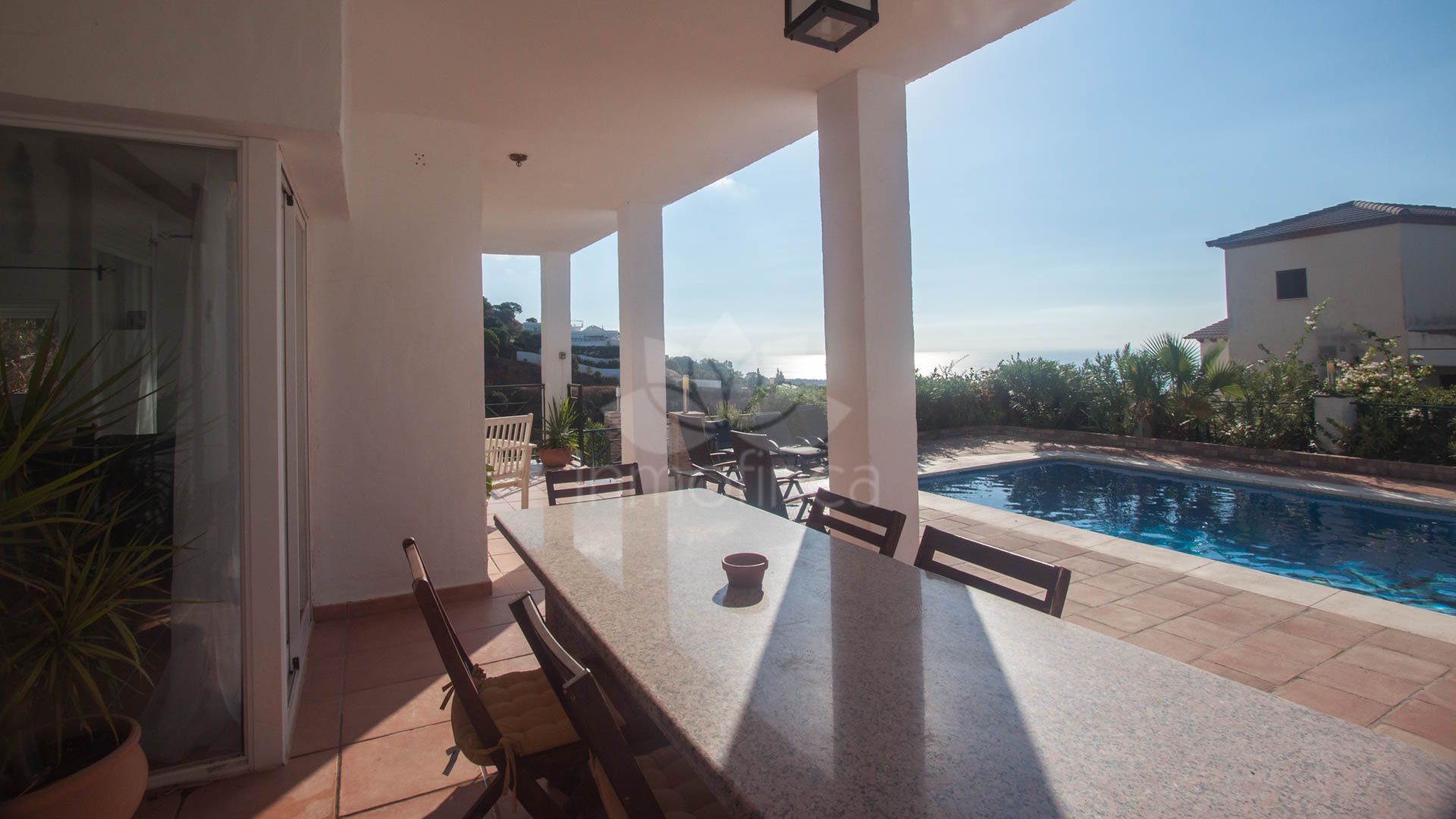 • Bright and spacious living room with fireplace, large windows, and sliding glass doors that open onto a covered porch with direct access to the pool and gardens – ideal for enjoying the sea views all year round.