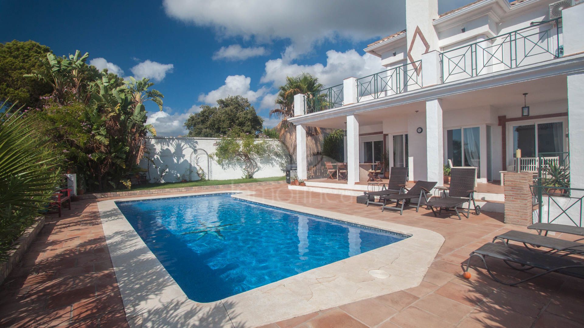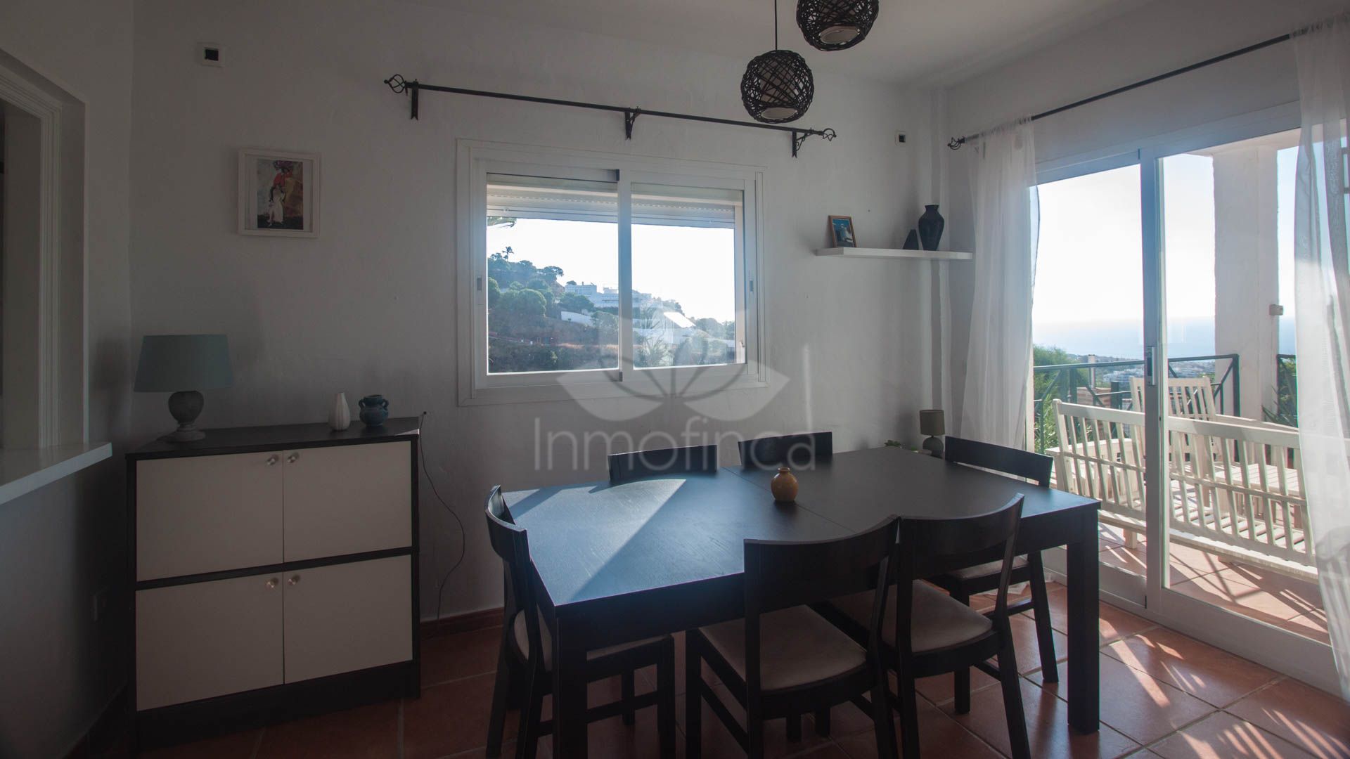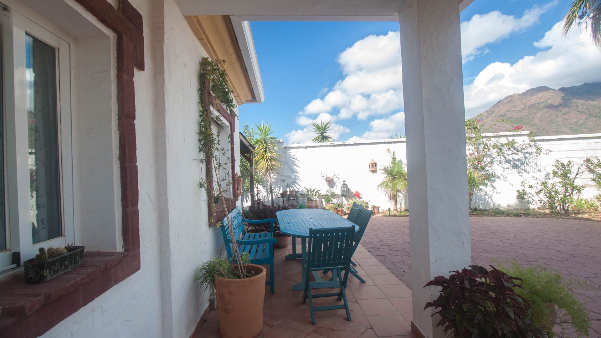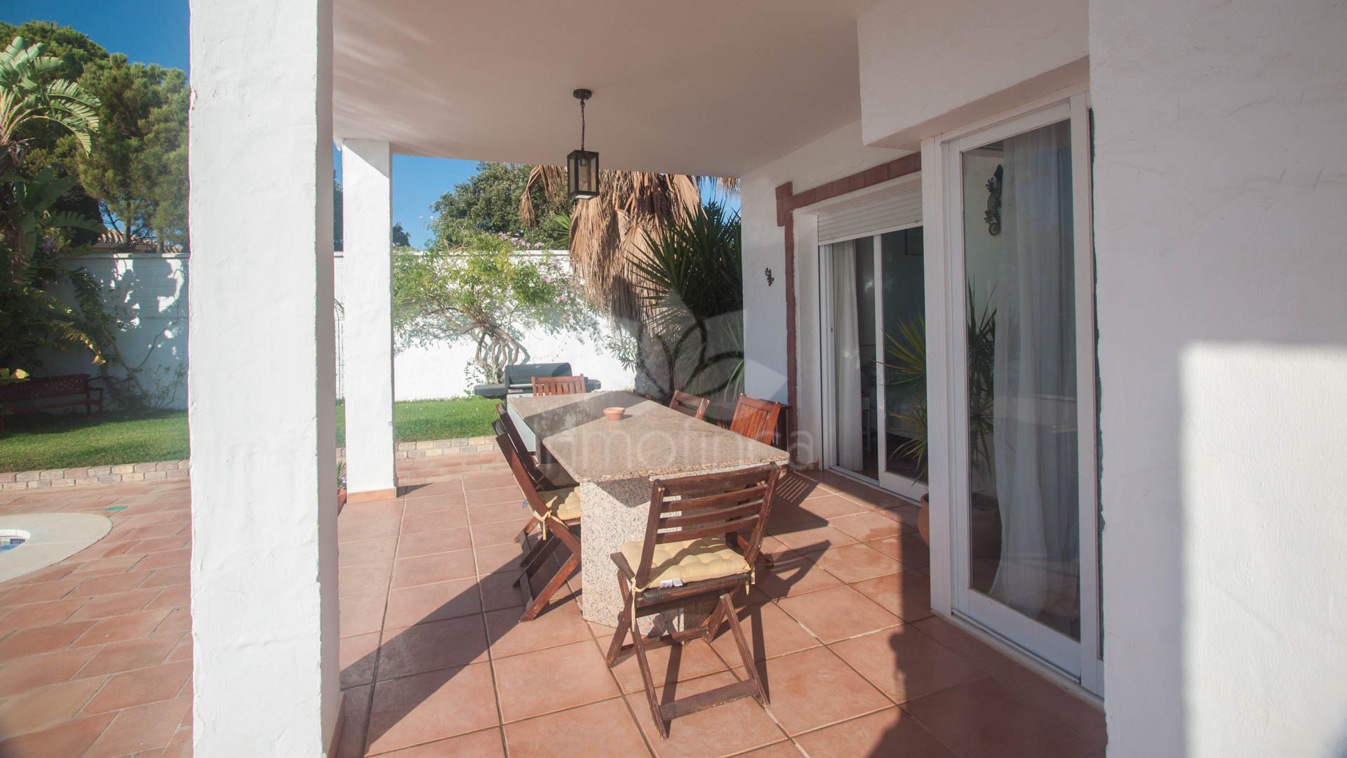 • Bright and spacious living room with fireplace, large windows, and sliding glass doors that open onto a covered porch with direct access to the pool and gardens – ideal for enjoying the sea views all year round.