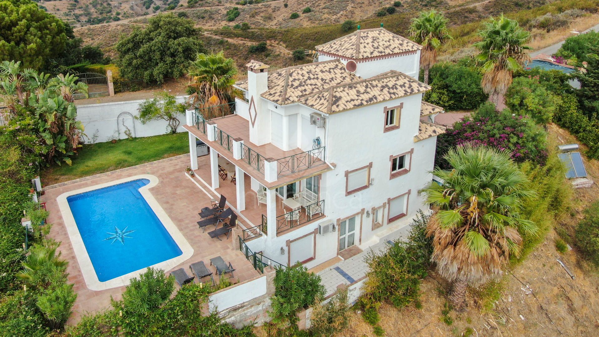 This Andalusian-style villa, featuring rustic touches and elegant architectural design, is built across three levels, with access through an electric gate that opens onto a spacious parking area.