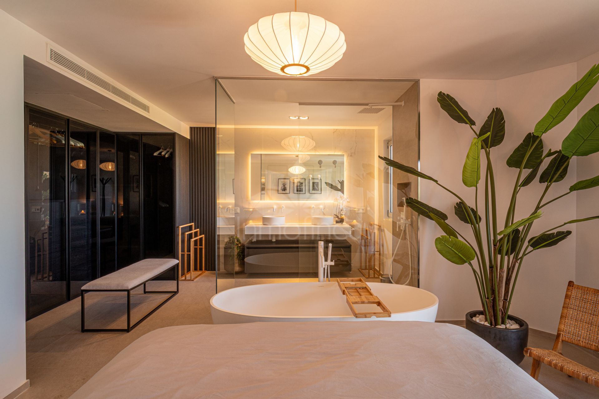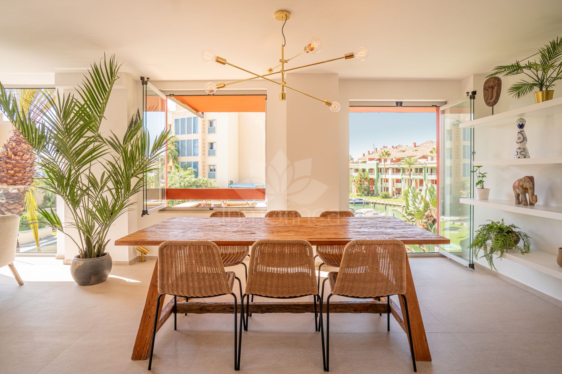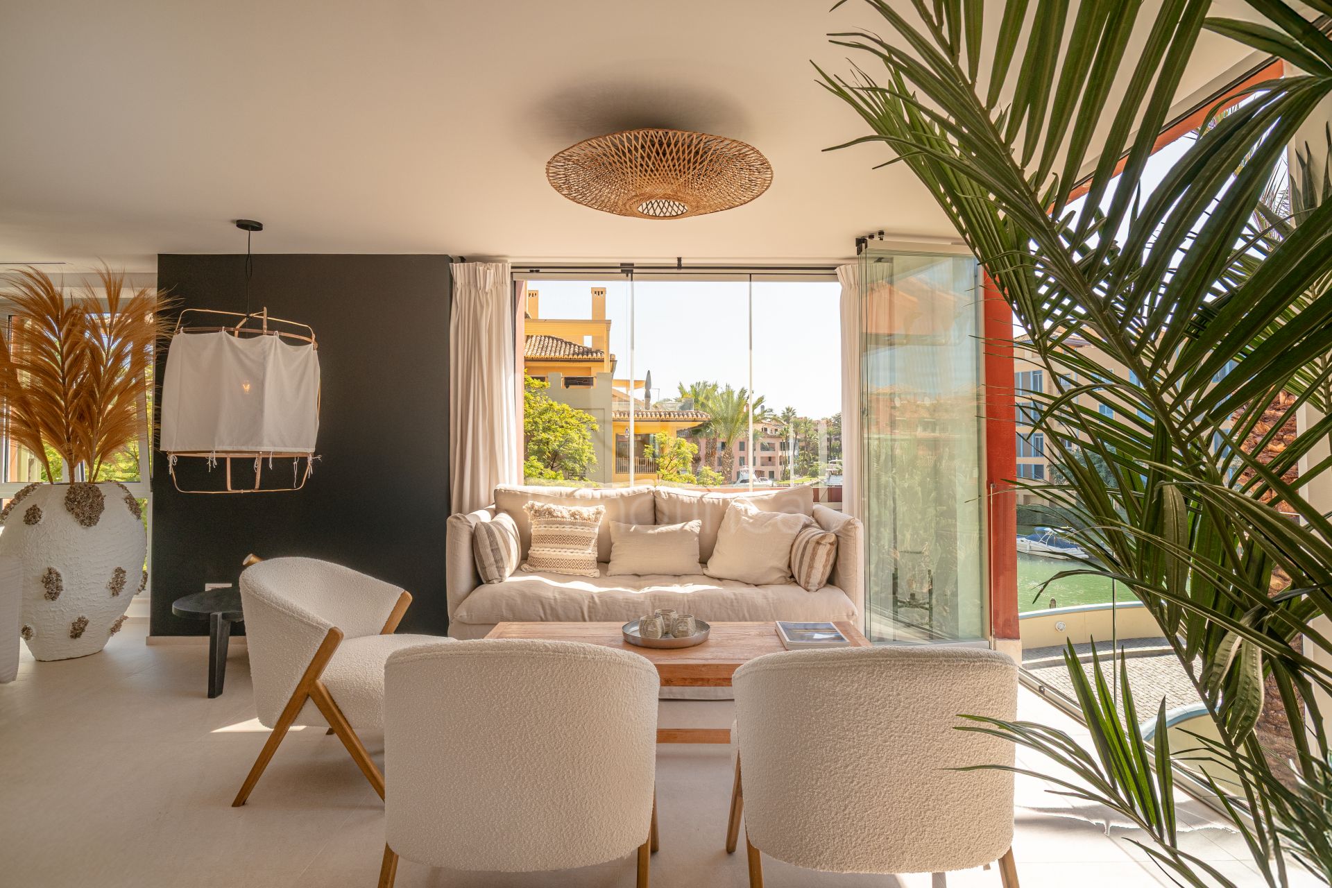 This three-bedroom apartment is located in the popular Ribera de la Romana residential complex in Sotogrande Marina, within walking distance of the port with all its restaurants, shops, and the Sotogrande beach. The apartment has been completely renovated with great attention to detail and high-quality finishes. Spacious and open-plan, the apartment has a total of 211 square meters. The bright entrance area is inviting and opens into the spacious living area with a stylish oil fireplace. To the front, there is a further lounge and dining area, which is flooded with light thanks to the fully opening windows and offers fantastic views of Sotogrande marina. The new high-quality fitted kitchen is open to the dining area and all the technical appliances are of the highest quality, such as Smeg appliances from the Dolce & Gabbana line. The apartment has three bedrooms, all with fitted wardrobes and en-suite bathrooms. A particular highlight is the spacious master bedroom, which has a walk-in wardrobe with glass doors and indirect lighting, as well as an open-plan bathroom with a large walk-in shower and a floating bath. Everything in the apartment is of the highest quality and is being sold fully furnished. Other features include: new Daikin air conditioning, a special indirect lighting system throughout the apartment, a storage room, and an underground parking space.
