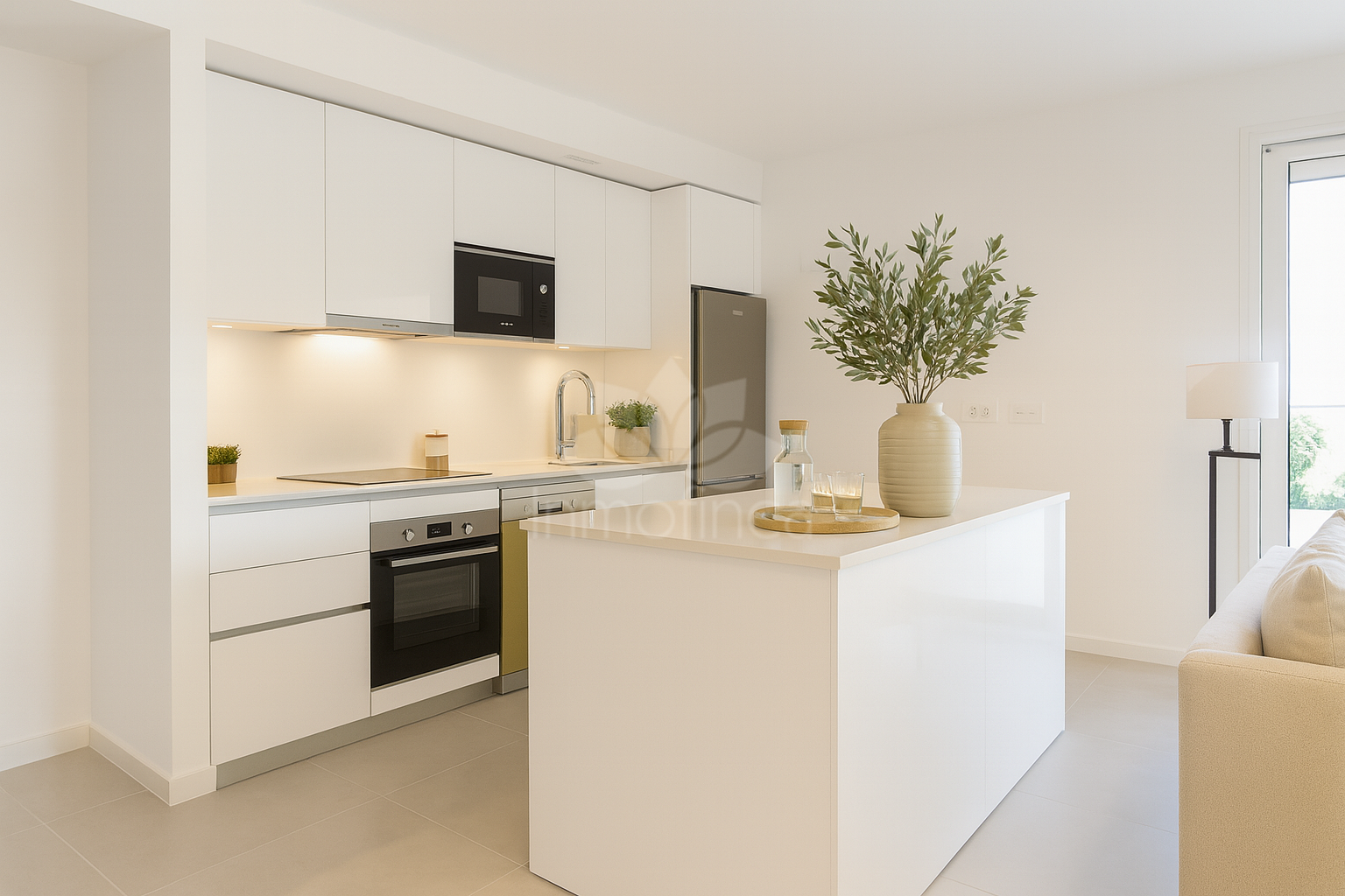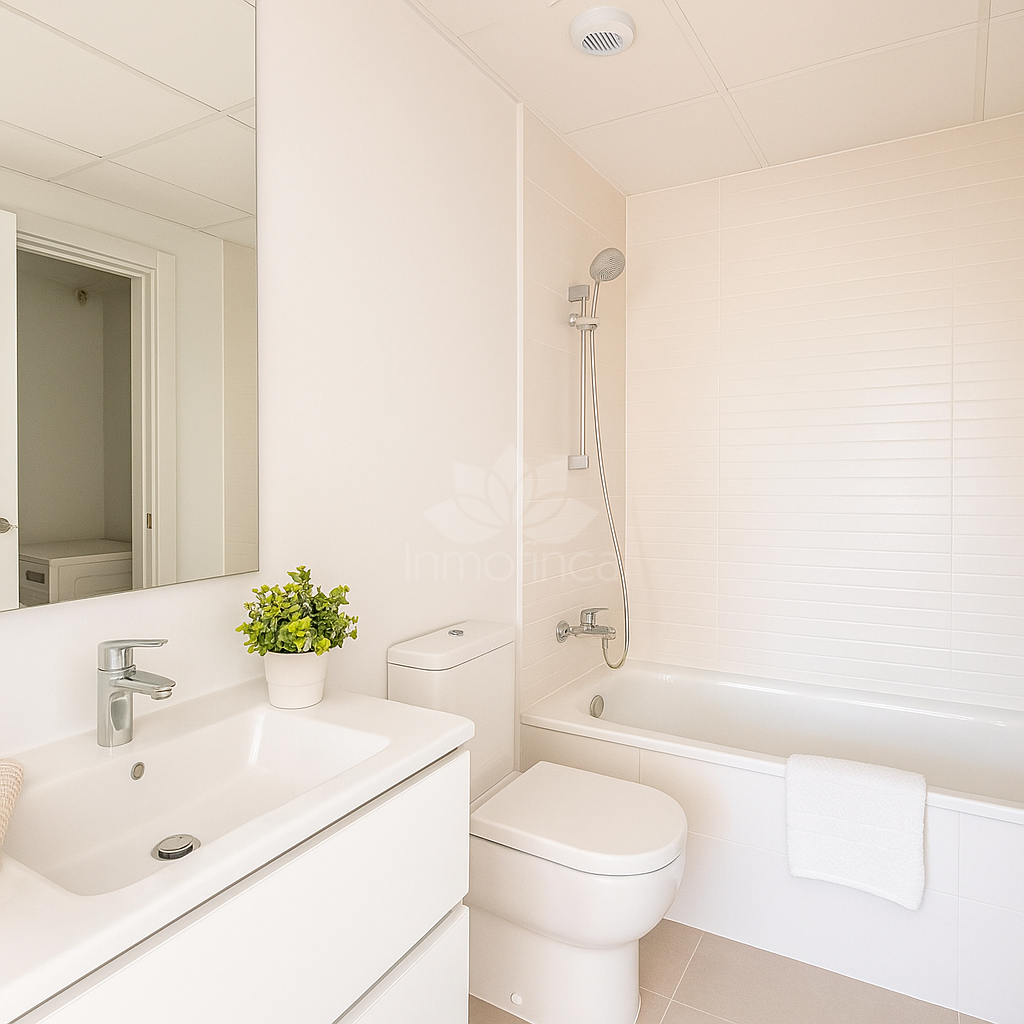 This bright and contemporary home offers a spacious open-plan layout that seamlessly connects the fully equipped kitchen, dining area and living room. Large floor-to-ceiling sliding doors lead directly onto a generous terrace of approx. 20 m², perfect for outdoor dining, relaxing or enjoying the Mediterranean climate.