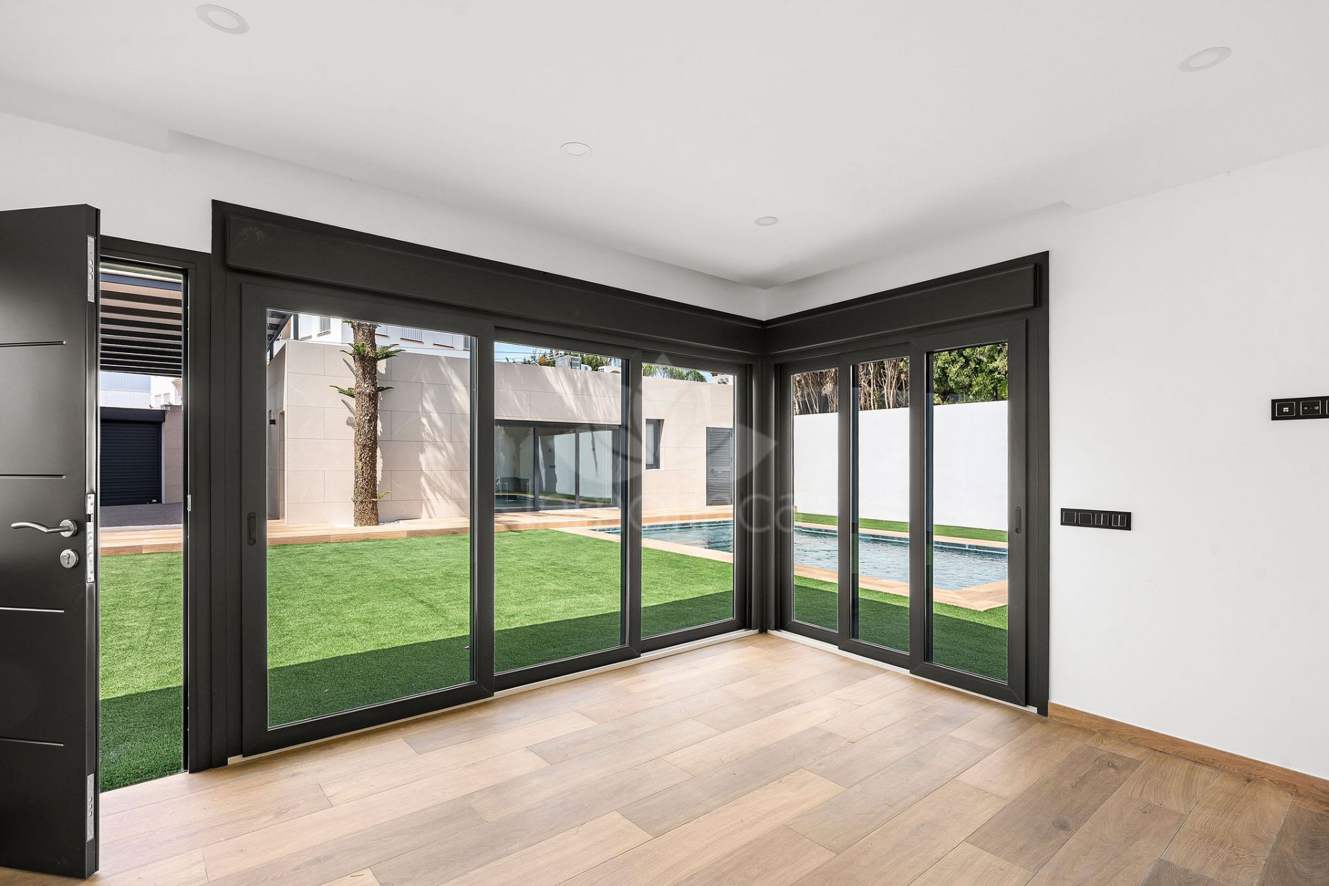 Large sliding doors lead out to a private swimming pool and sunny terraces, creating a seamless indoor-outdoor lifestyle. The low-maintenance garden is ideal for relaxing, sunbathing, or al fresco dining.