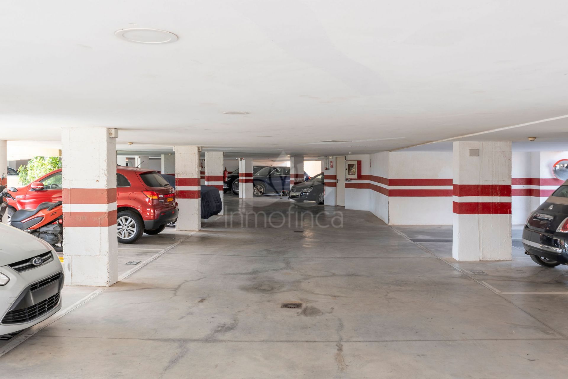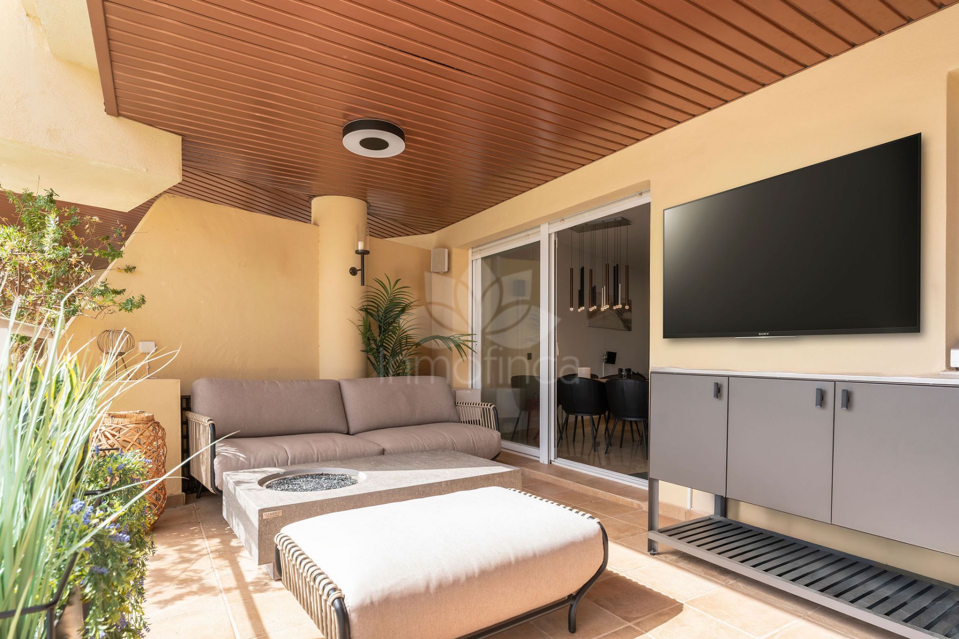 Enjoy a bright and inviting living space with elegant marble flooring, and direct access to a large covered terrace with south west orientation, offering views of the pool and partial sea views.