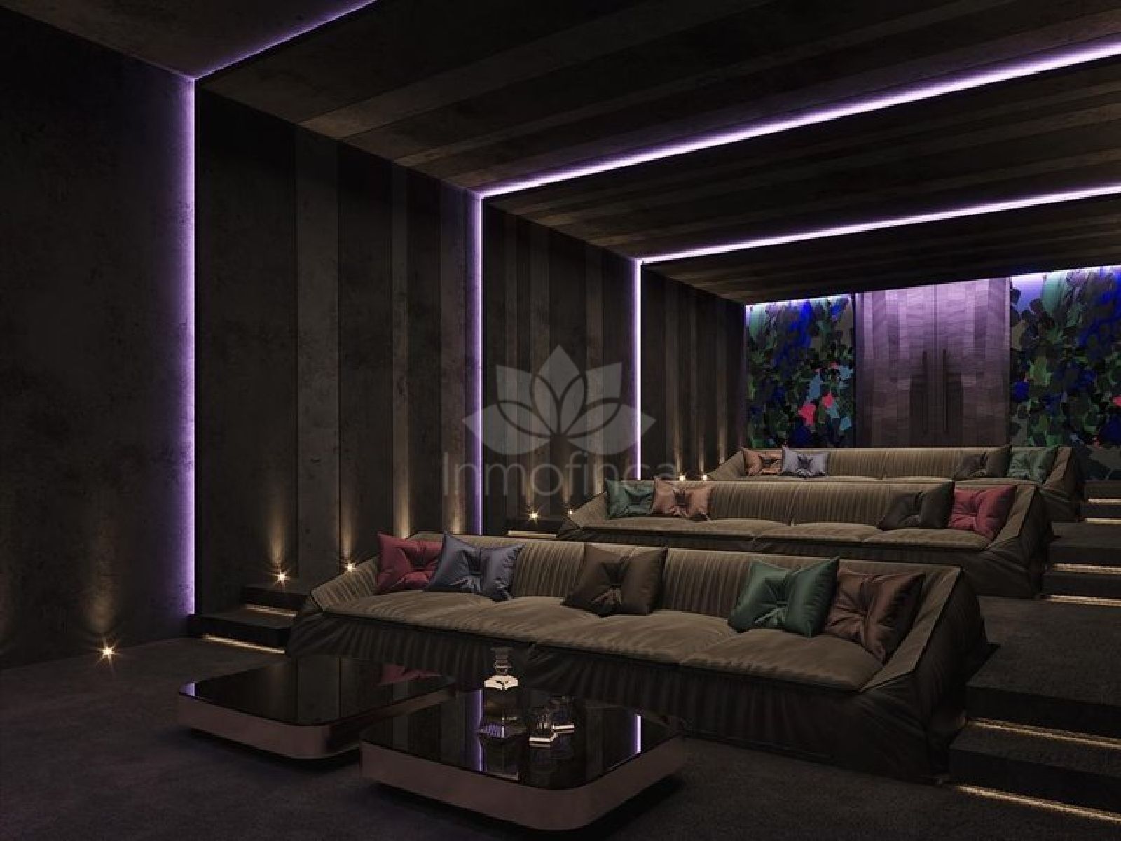 The villa’s interiors have been carefully designed to combine comfort, functionality, and elegance. High-quality finishes, such as porcelain flooring, double glazing, and glass doors, are complemented by modern features including a fully equipped kitchen, utility room, laundry room, and a small auxiliary kitchen. The living and dining areas are spacious and feature a fireplace, Dolby Stereo Surround system, and access to several terraces, both covered and uncovered, offering stunning views of the private garden, heated pool, and the adjacent golf course. Other highlights include a wine cellar, cinema room, games room, gym, sauna, and a basement providing ample storage space.
