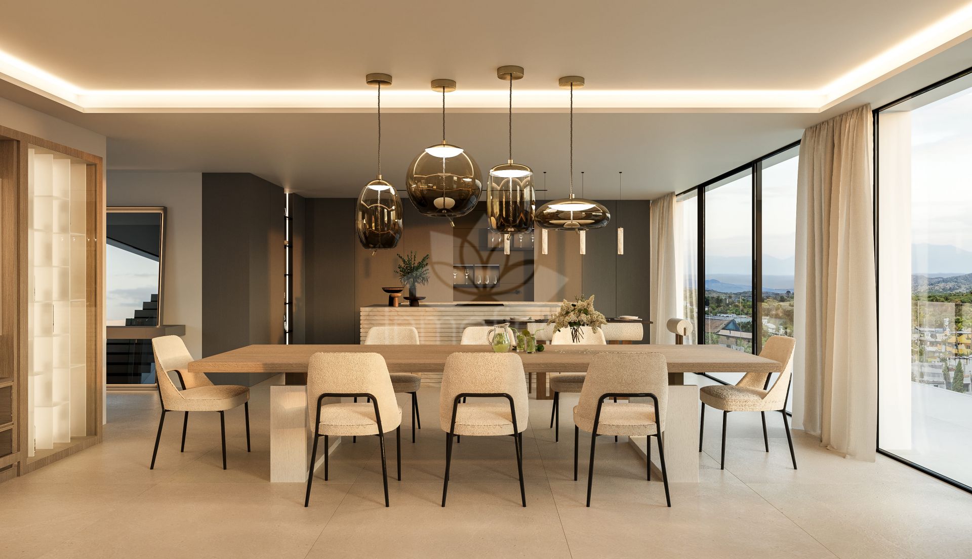 Designed by renowned architects Jesús Estepa Rubio and Antonio Estepa Rubio of ER Arquitectos, and styled by AALTO Exclusive Design, the villa showcases a harmonious fusion of natural stone, sleek glass elements, and clean architectural lines. The open-plan living and dining areas are bathed in natural light, thanks to floor-to-ceiling windows that frame breathtaking views of the surrounding landscapes.