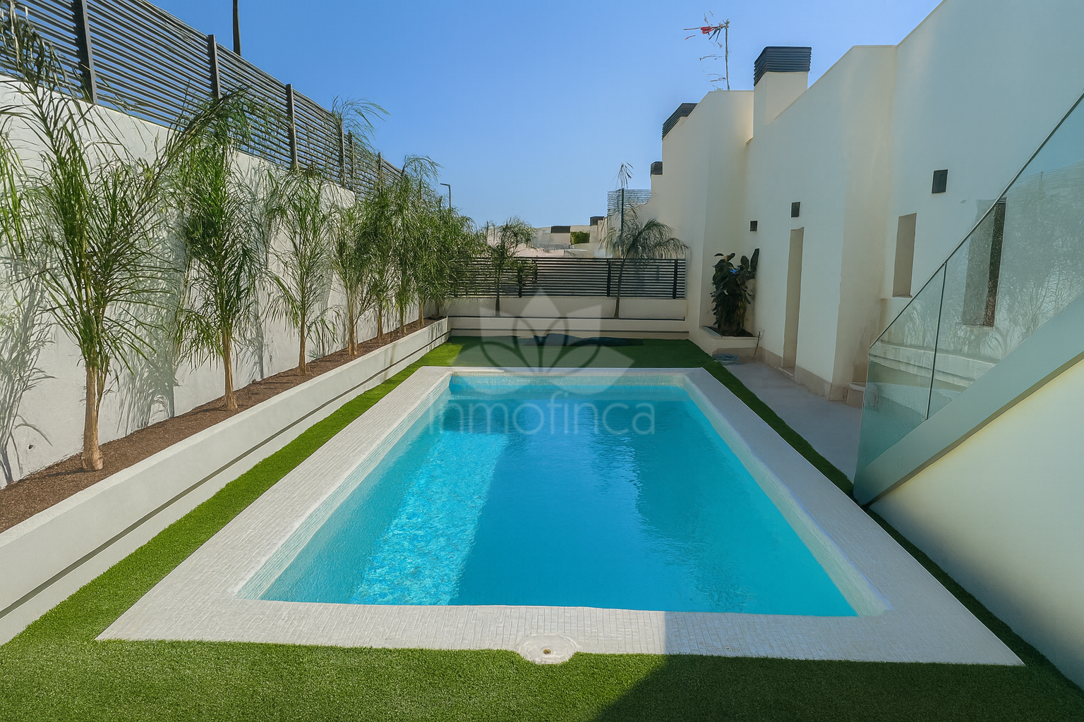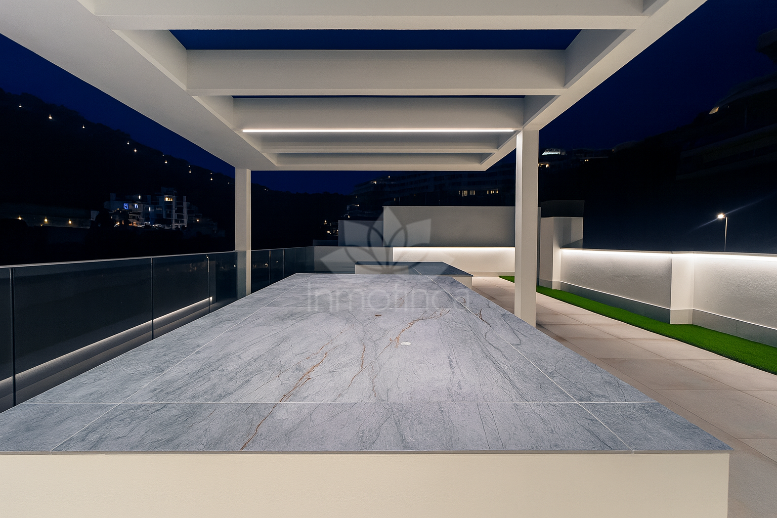 The main floor features a spacious open-plan living and dining area connected to a sleek modern kitchen with premium appliances and ambient LED lighting. Floor-to-ceiling windows open onto a stunning 97 m² terrace with a brand-new private pool — the perfect setting for relaxing, entertaining, and enjoying the Costa del Sol sunshine.