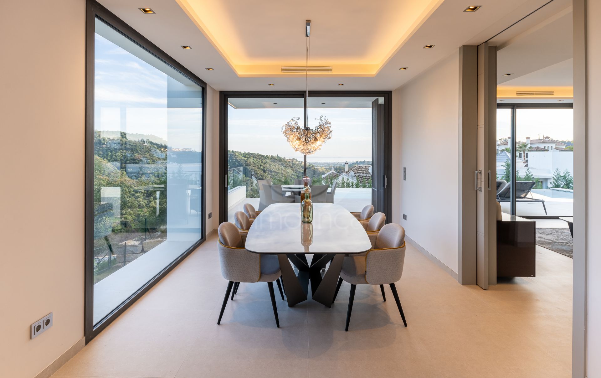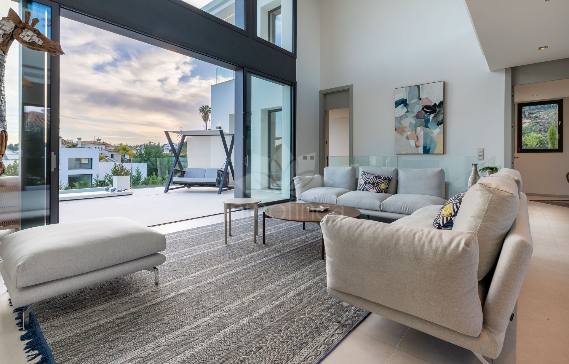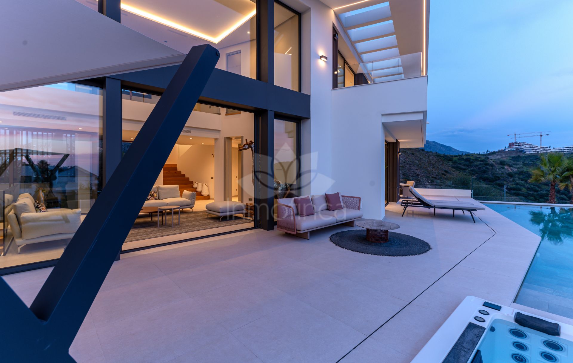 Esta nueva villa de seis dormitorios está situada en una parcela orientada al sur en la exclusiva comunidad cerrada de Lomas de la Quinta, a cinco minutos de los clubes de golf Los Naranjos y La Quinta. Con impresionantes vistas al mar Mediterráneo y a la montaña, piscina infinita de agua salada, sistemas domóticos, solárium en la azotea, sala de cine y la posibilidad de crear un apartamento para invitados, esta propiedad ofrece una oportunidad irresistible en una zona en rápido crecimiento.