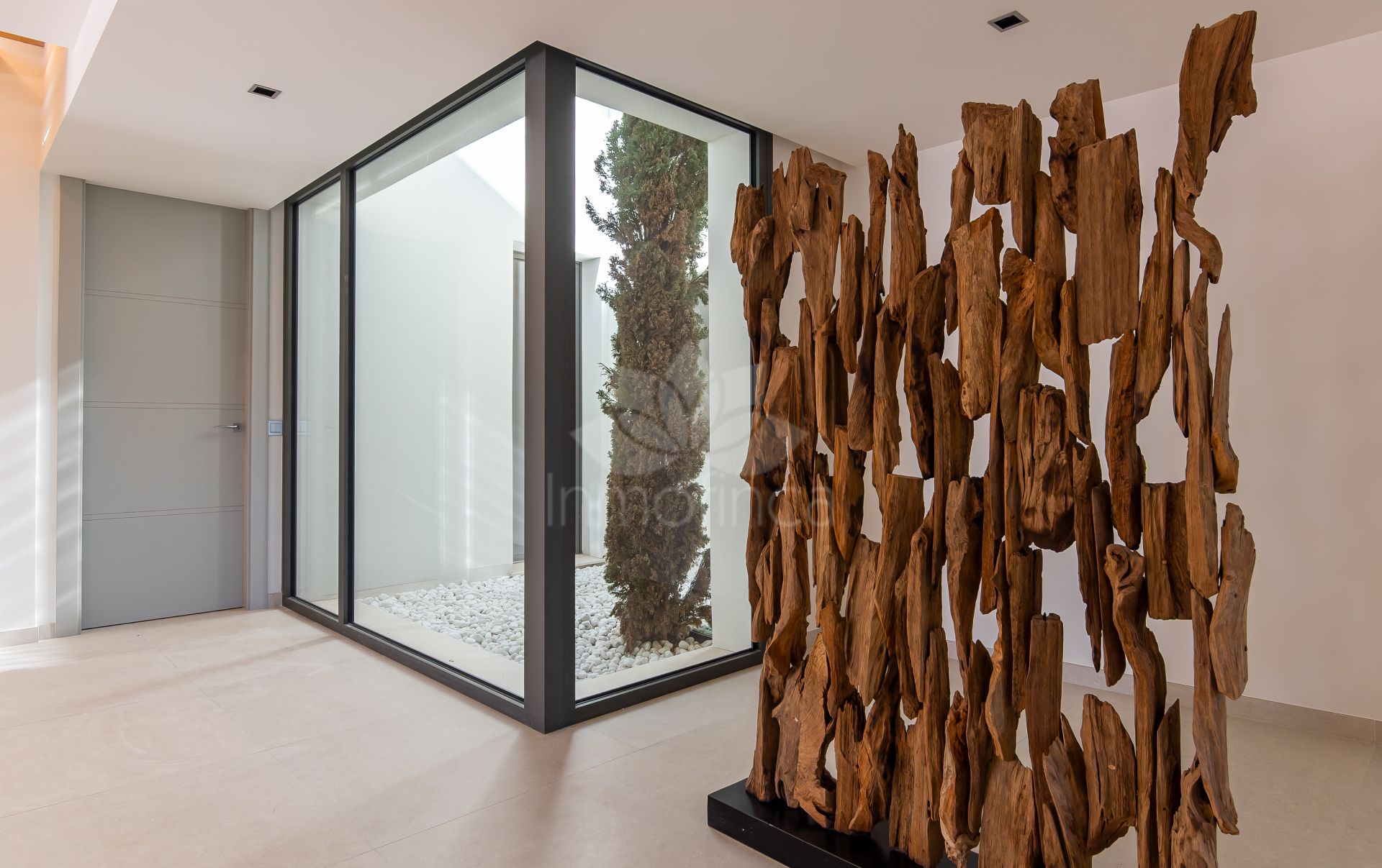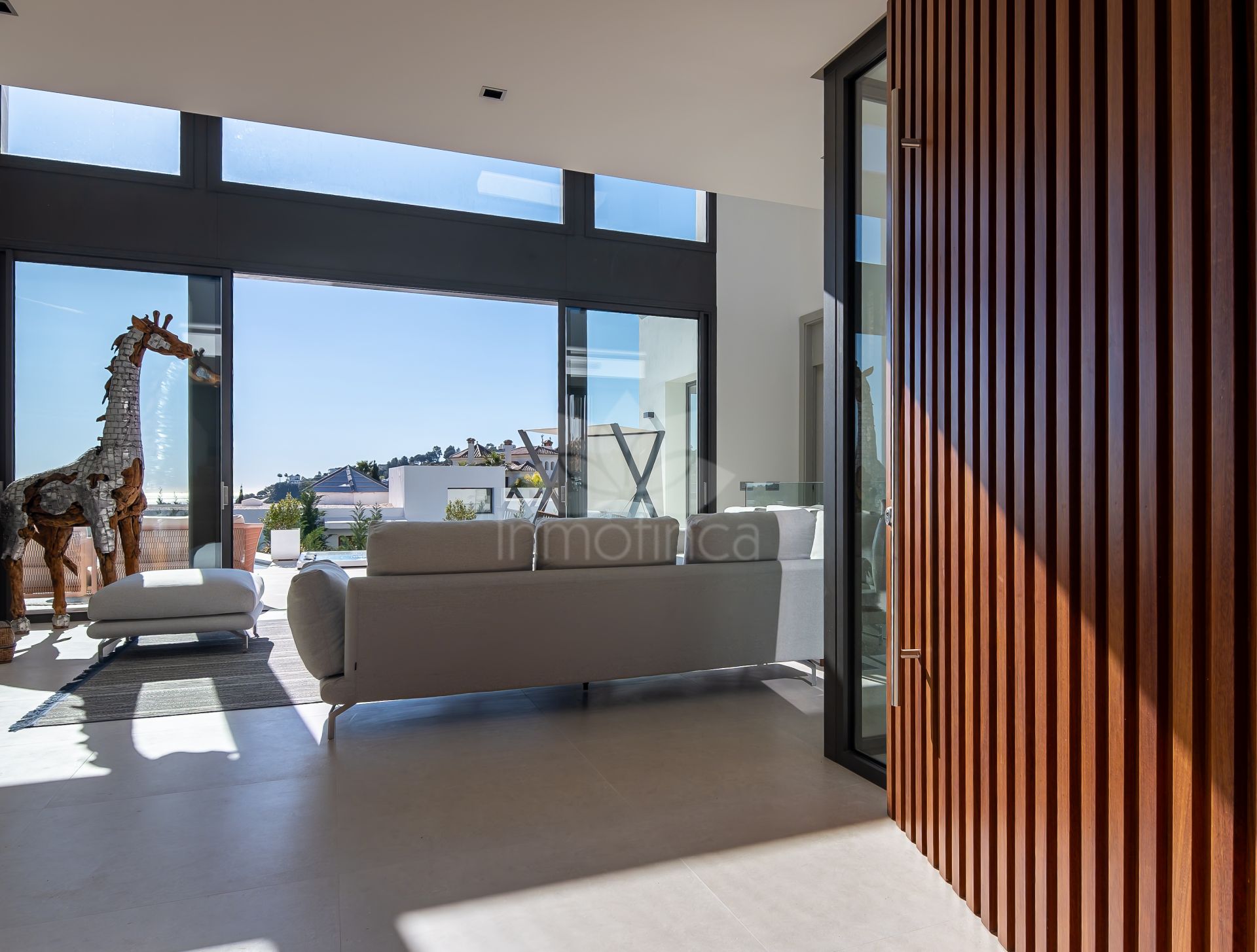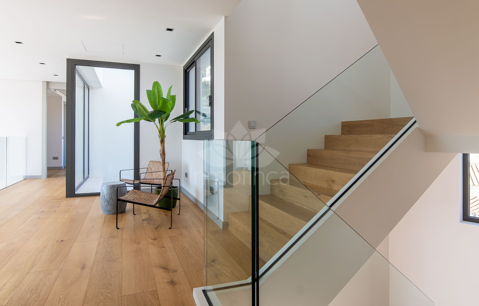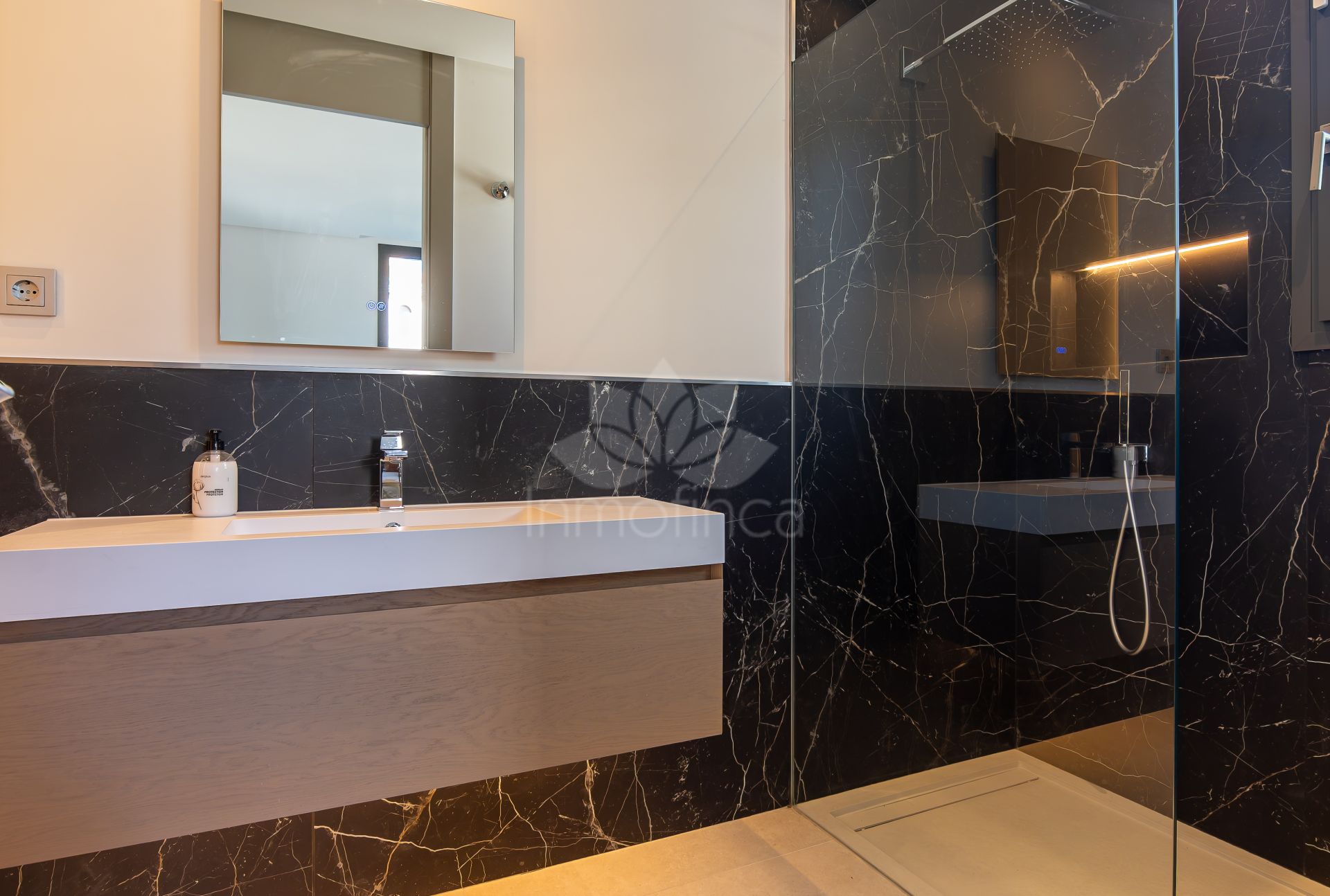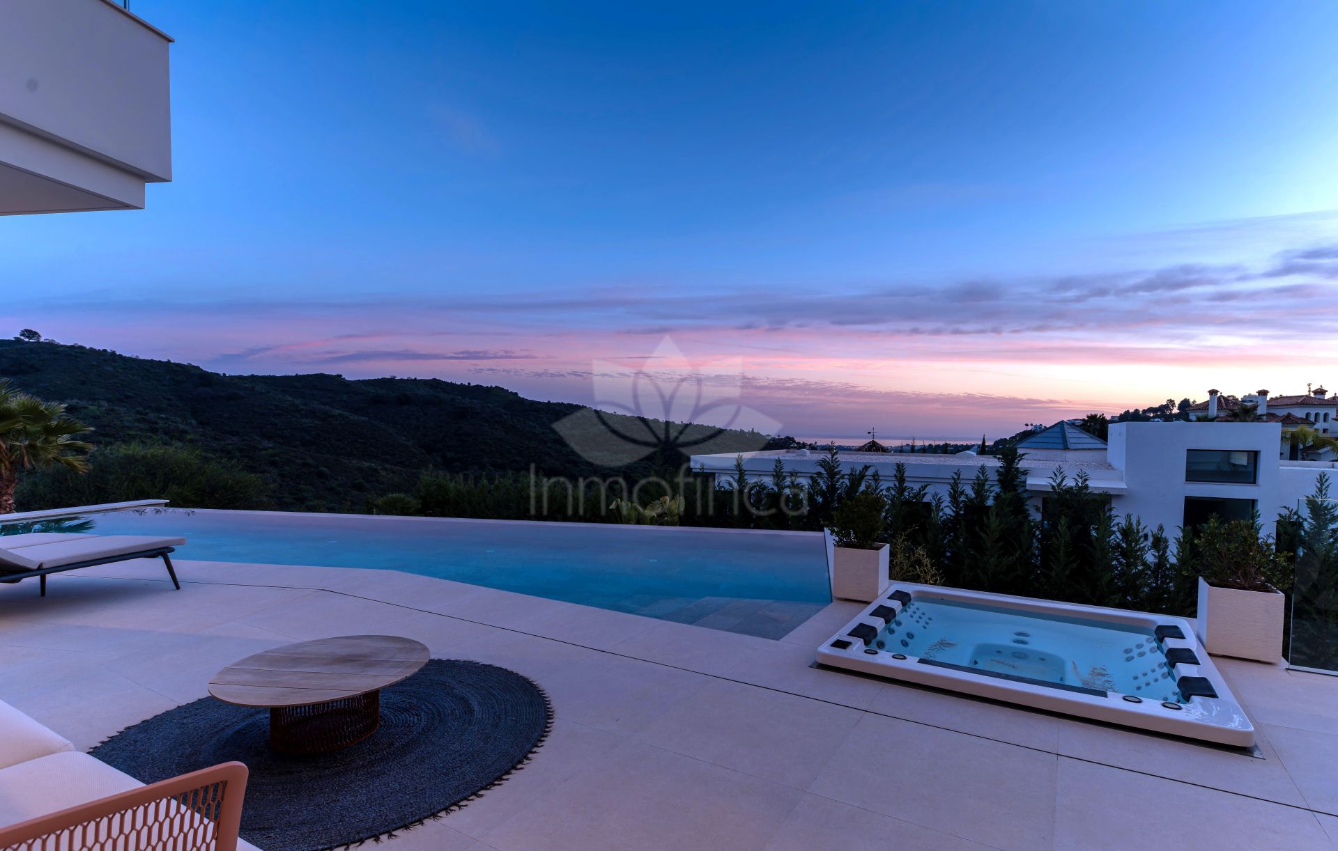 Situada en una parcela de 1.377 m², esta vivienda de 764 m² combina arquitectura moderna, espacios sofisticados, elementos naturales y un extraordinario potencial de personalización. Se accede a la casa a través de un patio ajardinado y una puerta pivotante de madera de gran tamaño que da paso a la planta principal, que cuenta con dos salones con vistas panorámicas al mar, una cocina abierta totalmente equipada y un comedor con vistas al mar y a la montaña, además de dos amplios dormitorios de invitados con baño y un aseo. La sala de estar principal cuenta con una chimenea y un techo de doble altura que se abre a la terraza principal, donde se puede cenar o relajarse junto a la piscina infinita de agua salada (con preinstalación para calefacción) y el jacuzzi mientras se disfruta de las vistas panorámicas.
