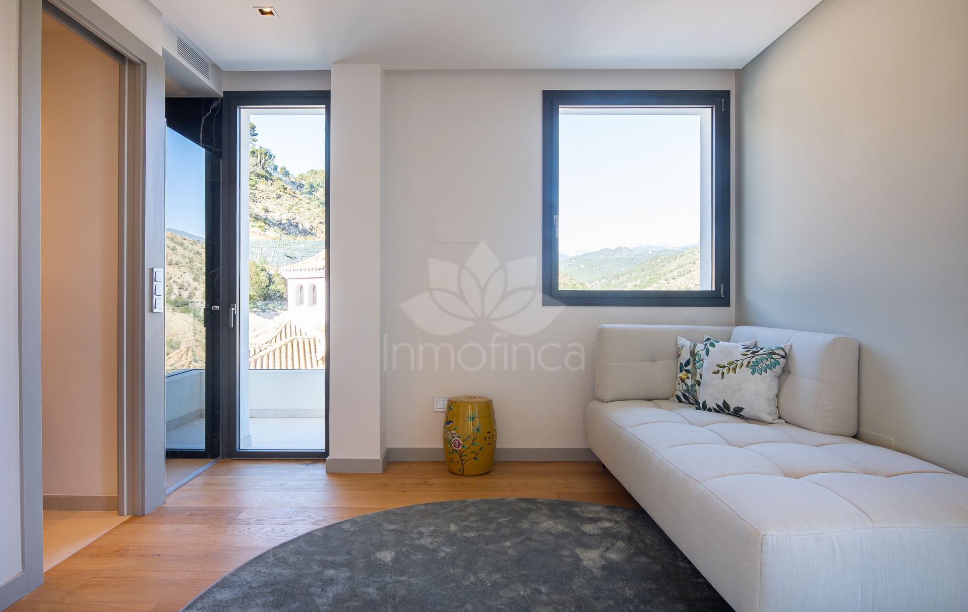 Subiendo las amplias escaleras de madera, se accede a una galería abierta que conecta la luminosa planta superior con el entorno panorámico, perfecta para una oficina diáfana o una zona de descanso interior. La suite principal también disfruta de vistas panorámicas, un amplio cuarto de baño en suite y un balcón secreto con vistas a la entrada y al salón principal. Esta planta también ofrece otras dos suites, todas con cuarto de baño privado, terraza y vistas impresionantes, perfectas para una familia o para crear una vivienda personalizada.