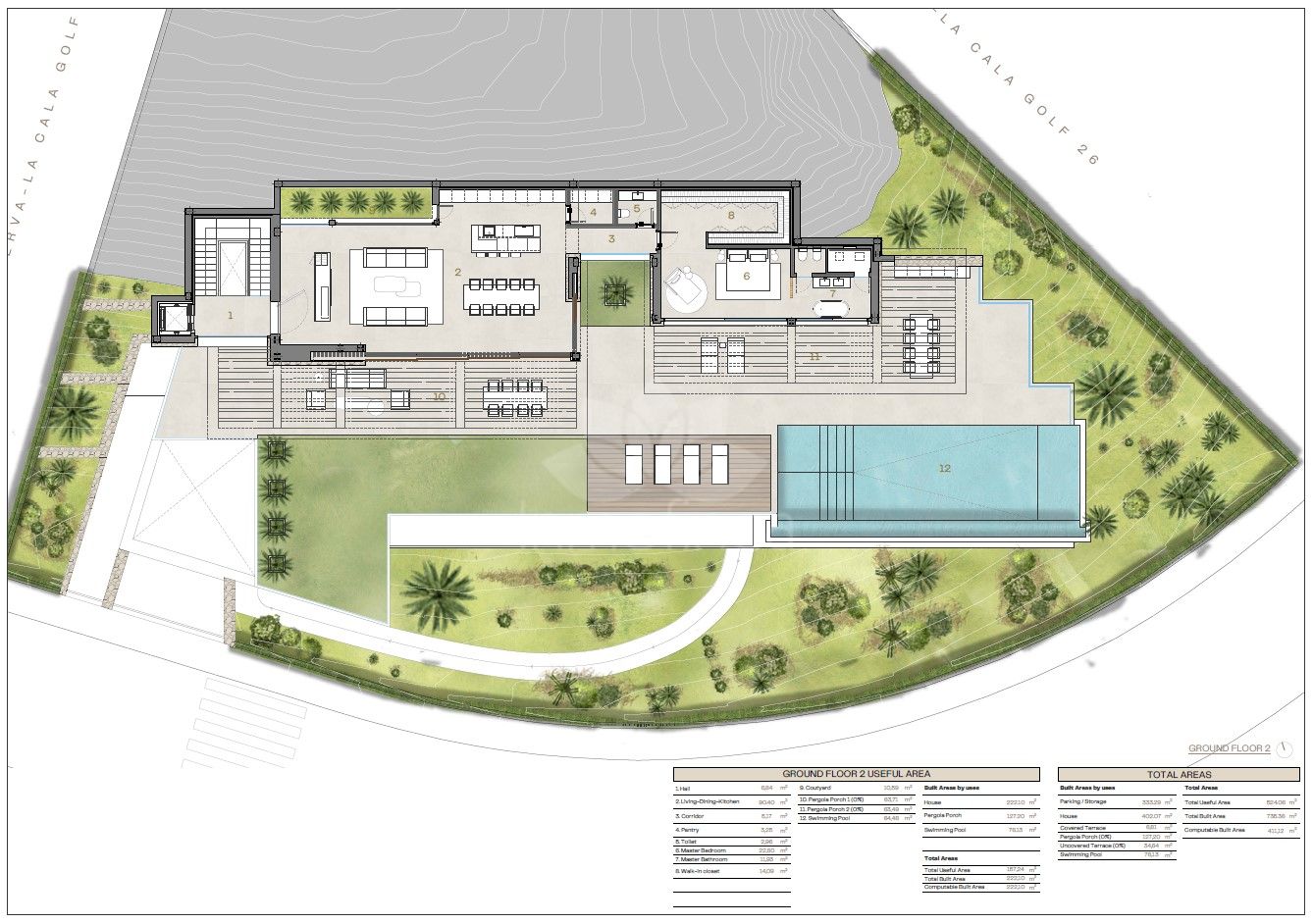 Proyecto de Villas: La Reserva de la Cala Golf. Esta villa contemporánea en venta está ubicada en La Cala Golf, Mijas Costa, entre Marbella y la ciudad de Málaga, Costa del Sol, Sur de España. El proyecto de villa de lujo ofrece fabulosas vistas panorámicas al mar y a la montaña, total comodidad y privacidad, rodeado de un hermoso paisaje verde. La propiedad se construirá con materiales de alta calidad y cuenta con 4 dormitorios, 4 baños en-suite, 1 aseo, cocina abierta totalmente equipada con electrodomésticos Miele y una cocina trasera adicional, terrazas cubiertas y descubiertas, piscina privada con agua salada, jardín mediterráneo con palmeras, olivos, cipreses y sistema de riego automático y garaje privado para 2 coches. También viene con aire acondicionado frío/calor, suelo radiante en toda la propiedad, ascensor, ventanas de piso a techo con doble acristalamiento, sistema domótico, placas solares y preinstalación para unidad de carga de vehículos eléctricos. Los extras y características personalizadas como se ilustran en imágenes 3D, como un quinto dormitorio en suite, sala de cine, fitness, jacuzzi, sauna, bodega, cocina exterior, piscina climatizada, etc., son opcionales y pueden incluirse como coste adicional (no incluidos en el precio de venta).