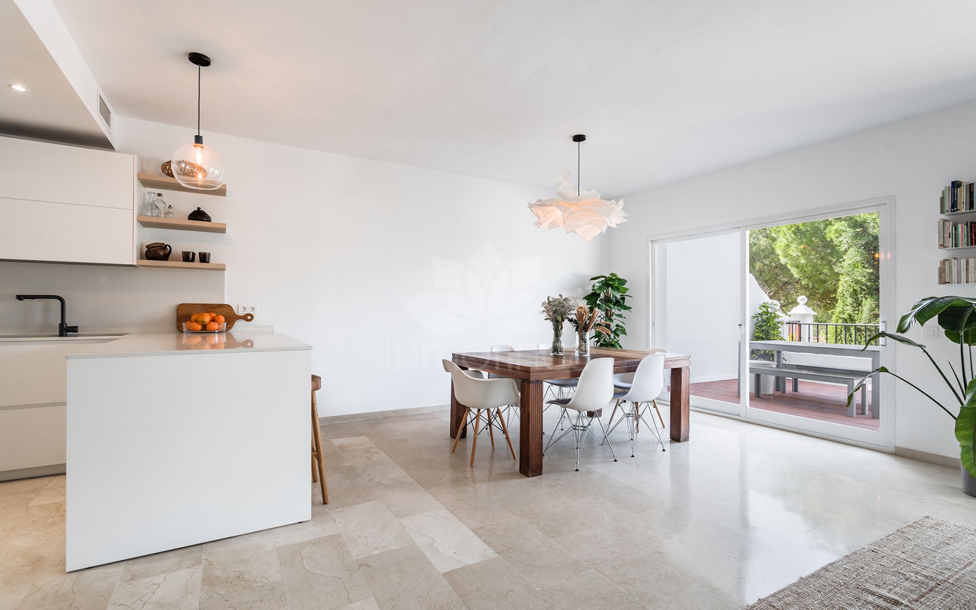 Espaciosa adosada de 4 plantas situada en Las Encinas, un complejo cerrado en primera línea de golf en La Quinta, Benahavís. Consta, en la planta principal, de: cocina de planta abierta totalmente amueblada y equipada; salón/comedor con acceso a una terraza con preciosas vistas al golf de La Quinta; dormitorio de invitados; baño de invitados.