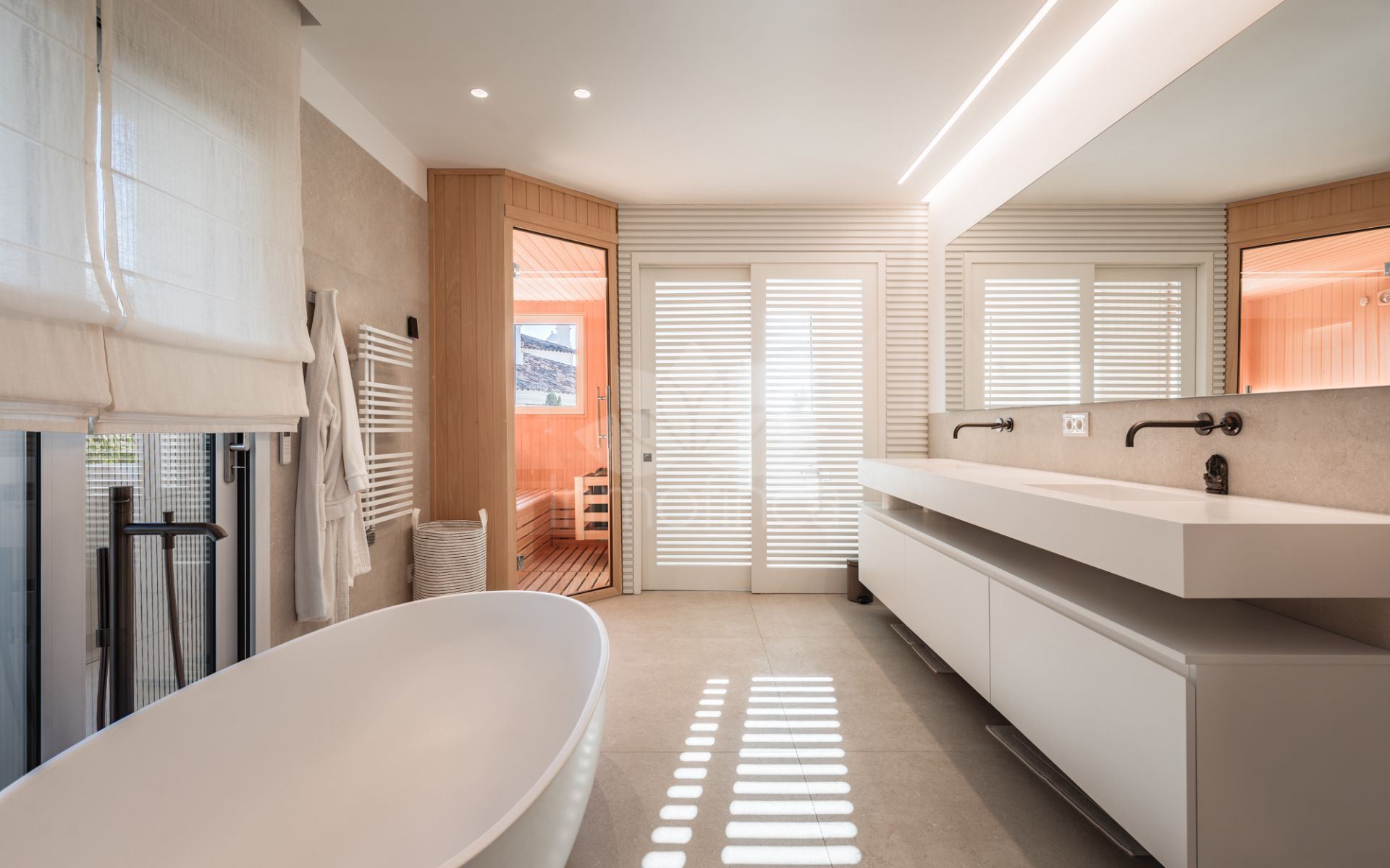 La propiedad cuenta con una suite principal con vestidor, baño en-suite y sauna, junto con dos dormitorios adicionales, uno de ellos en-suite. Otras comodidades incluyen un amplio salón y comedor, un aseo de invitados, varias terrazas grandes, una cocina moderna totalmente equipada, acceso privado por ascensor, calefacción por suelo radiante, cortinas eléctricas, mosquiteras en todas las puertas, sistema de domótica Gira y aparcamiento subterráneo para dos vehículos, todo ello integrado con avanzados sistemas de domótica.