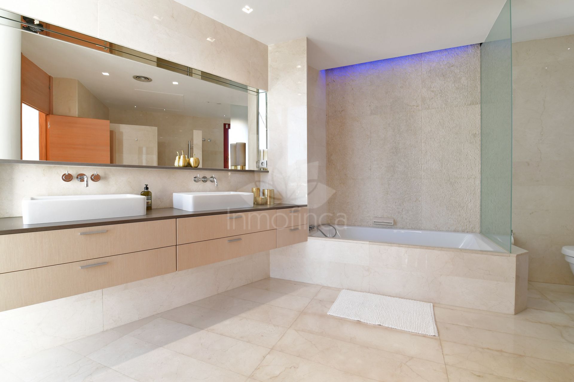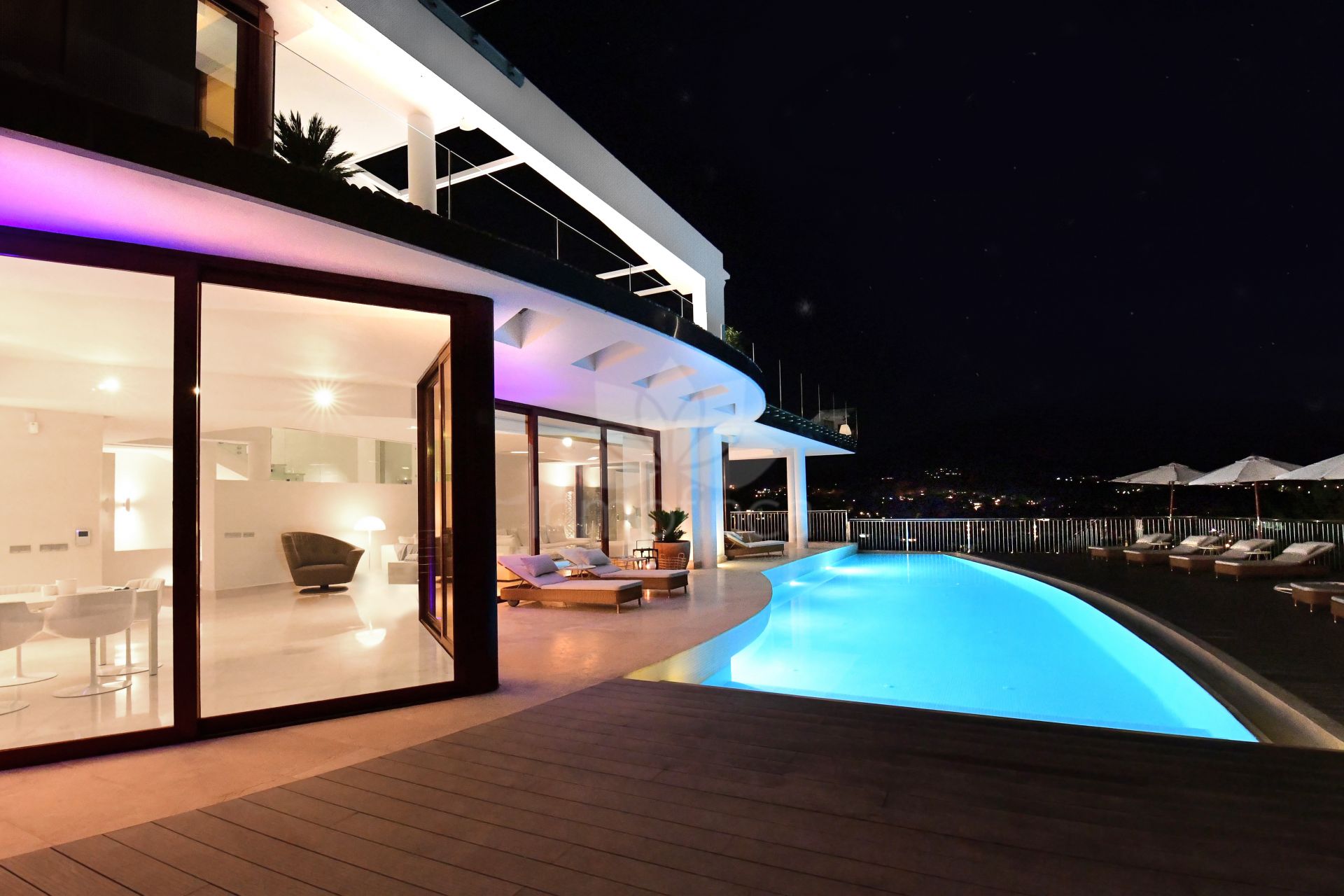En el exterior cuenta con una amplia terraza con palmeras, una gran piscina infinita climatizada y jacuzzi. La excelente zona de barbacoa es ideal para pasar el tiempo libre y cenar bajo las estrellas, mientras que el bar parcialmente cubierto y los asientos del salón en la terraza del segundo nivel pueden elevar el ambiente de calma a una gran fiesta con total privacidad y vistas hacia las montañas y el mar. Se trata de una impresionante vivienda de lujo.