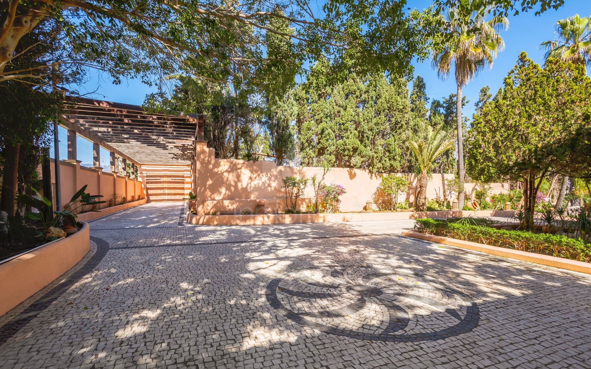 El oasis exterior está coronado por una resplandeciente piscina, que invita a los residentes a disfrutar de tranquilos baños o a tomar el cálido sol mediterráneo. Un amplio camino de entrada conduce a un garaje para dos coches, garantizando un amplio espacio de aparcamiento para residentes e invitados.