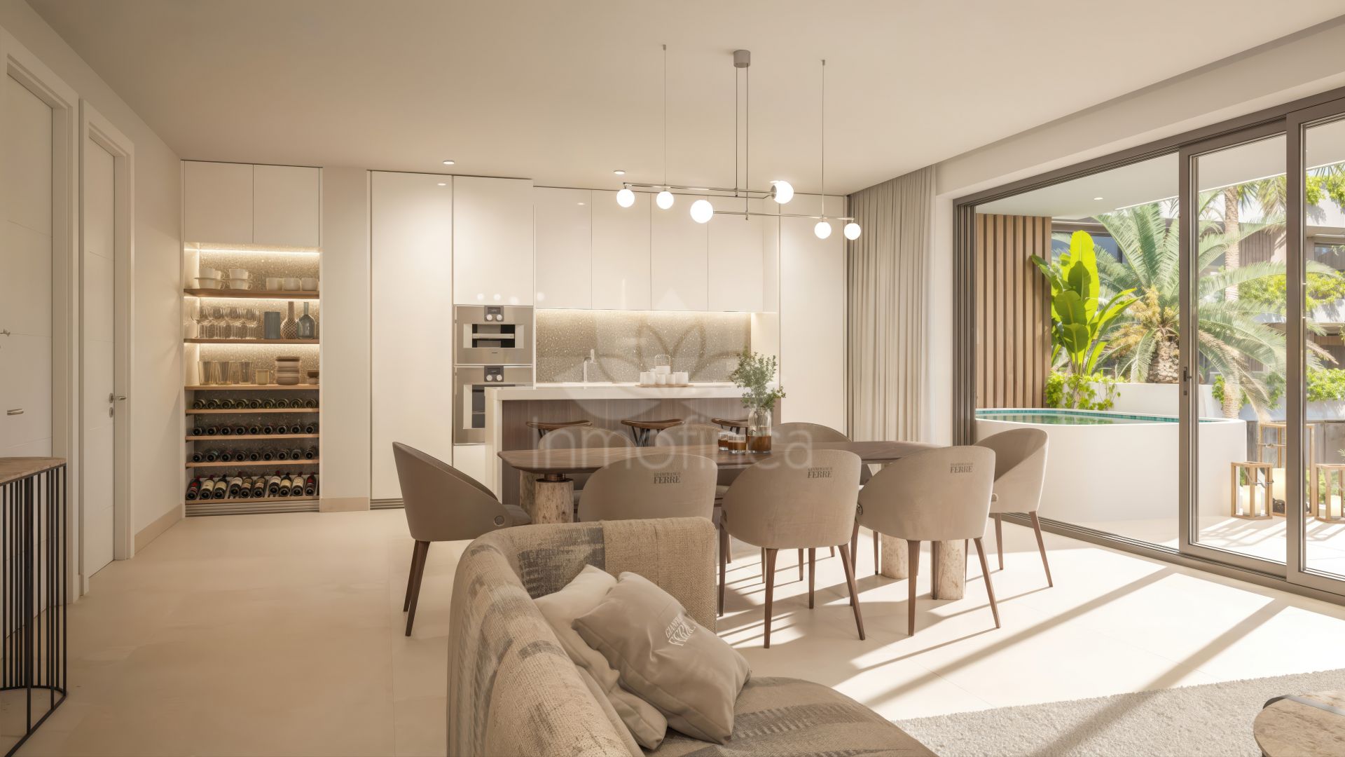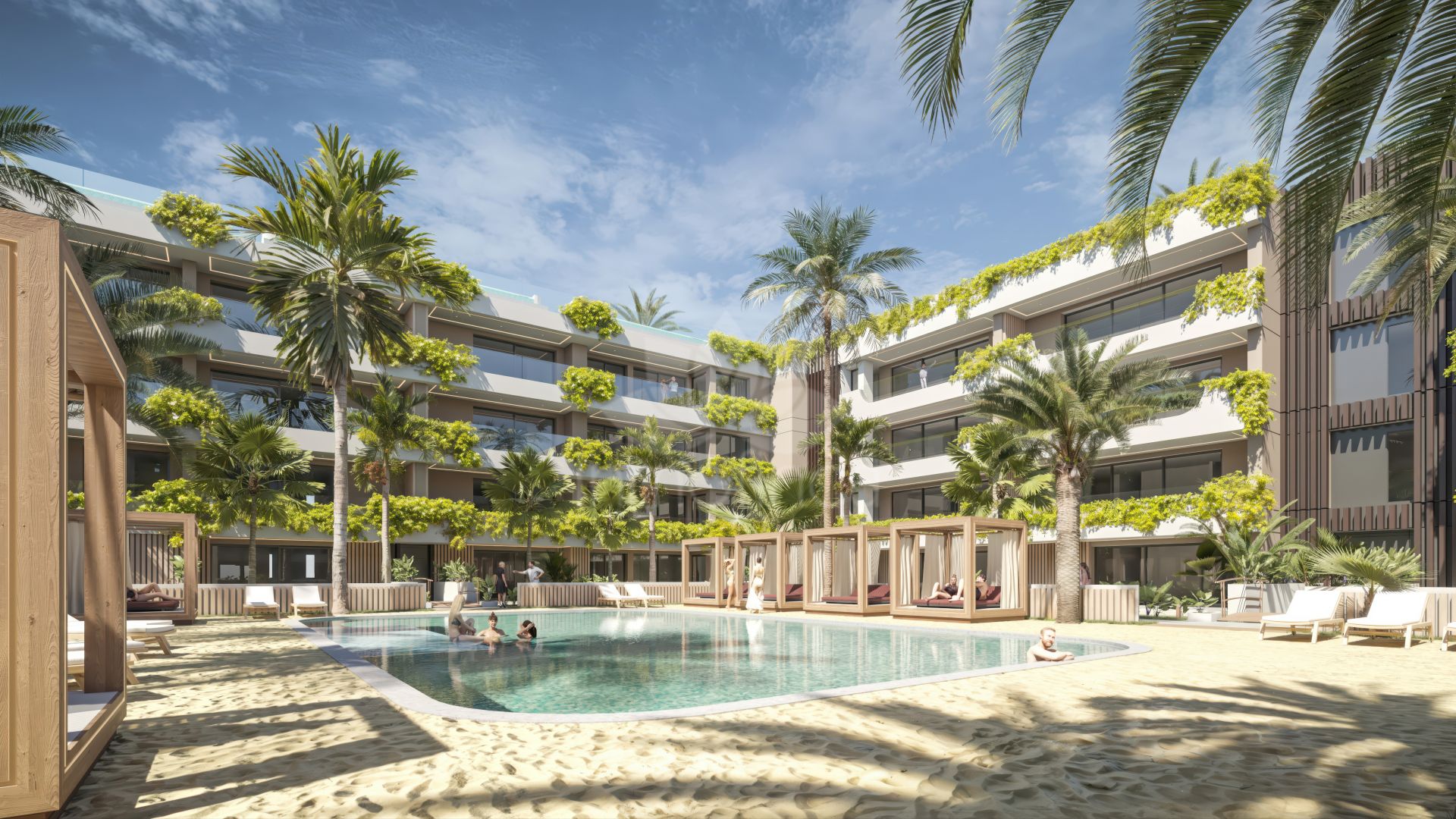 Espacios luminosos con diseño abierto, amplias terrazas y vistas panorámicas. Las viviendas planta baja disponen de jardines privados y piscinas tipo playa, mientras que los áticos cuentan con solárium y piscina privada.