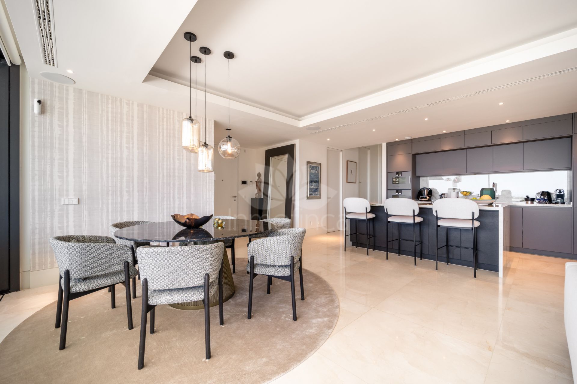 La joya de la propiedad es una amplia terraza orientada al sur, con vistas ininterrumpidas al mar y que inunda el interior de luz natural. El salón y comedor de planta abierta se integran con una cocina moderna equipada con electrodomésticos de alta gama y grandes ventanales eléctricos que se abren completamente, ampliando la experiencia de vida hacia el exterior.
