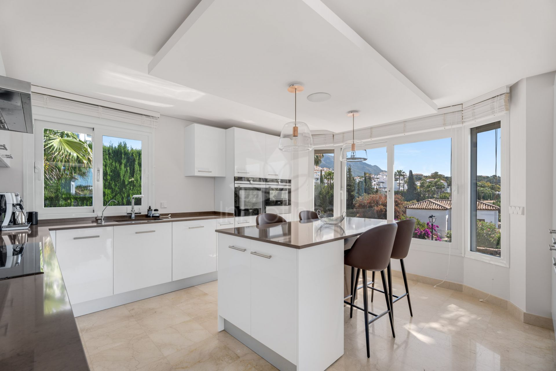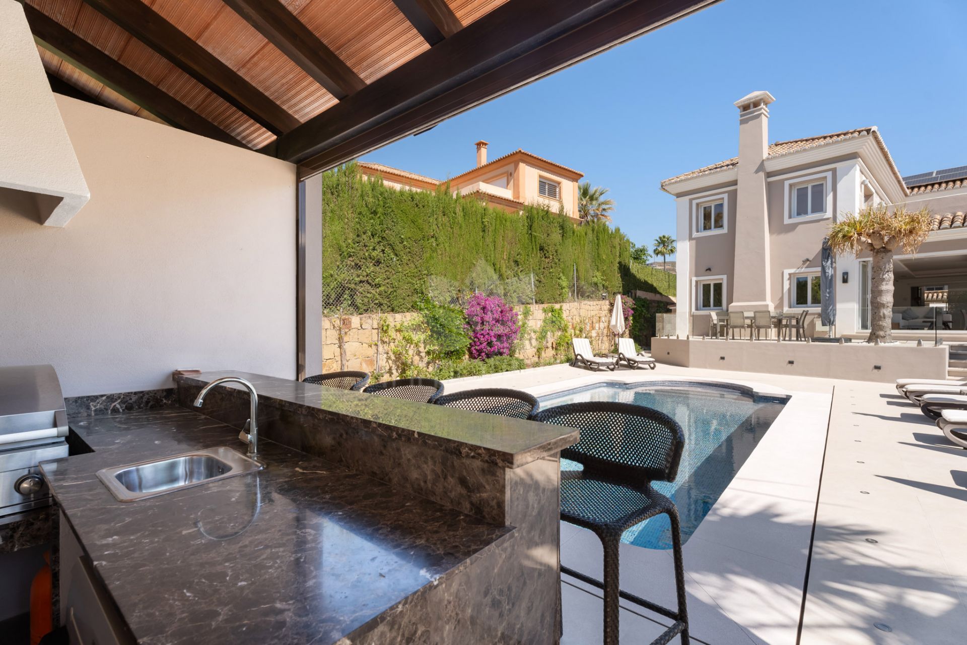 La villa cuenta con seis amplios dormitorios y cinco baños completos, cuatro de ellos en suite, además de un aseo para invitados, proporcionando máxima comodidad e independencia. El salón principal, con chimenea y suelos de mármol, se conecta a una terraza privada con vistas panorámicas al mar y la montaña. La cocina, totalmente equipada y con zona de office, se complementa con una cocina auxiliar y un práctico lavadero. El comedor, independiente y luminoso, resulta ideal para reuniones familiares y eventos sociales.