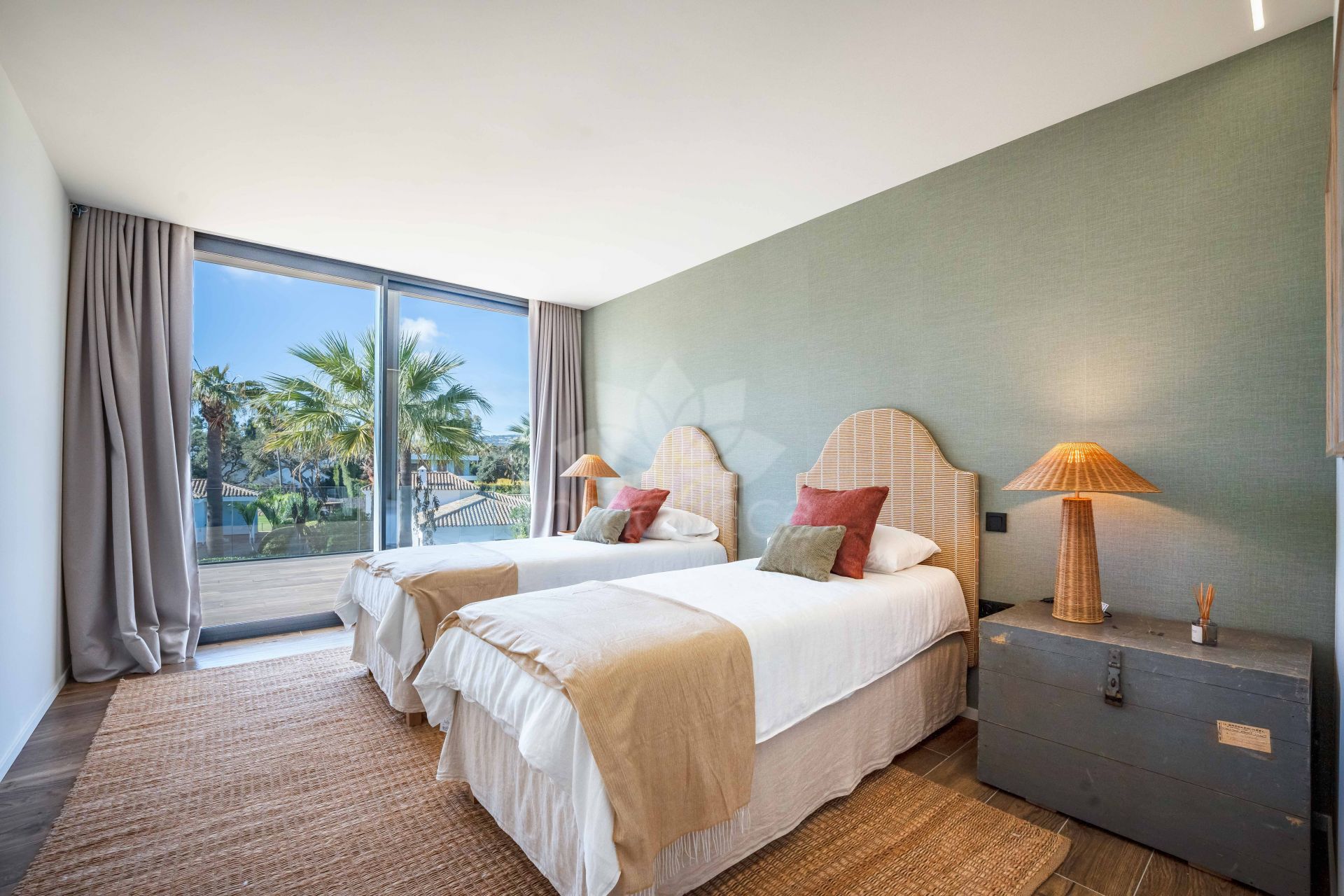 Esta villa moderna en Sotogrande tiene cinco amplios dormitorios, cada uno con su propio baño en suite, además de un aseo gratuito. Las áreas de vida de concepto abierto están llenas de luz natural y complementadas con una cocina de diseño totalmente equipada con electrodomésticos de alta gama y muebles de lujo en toda la casa.