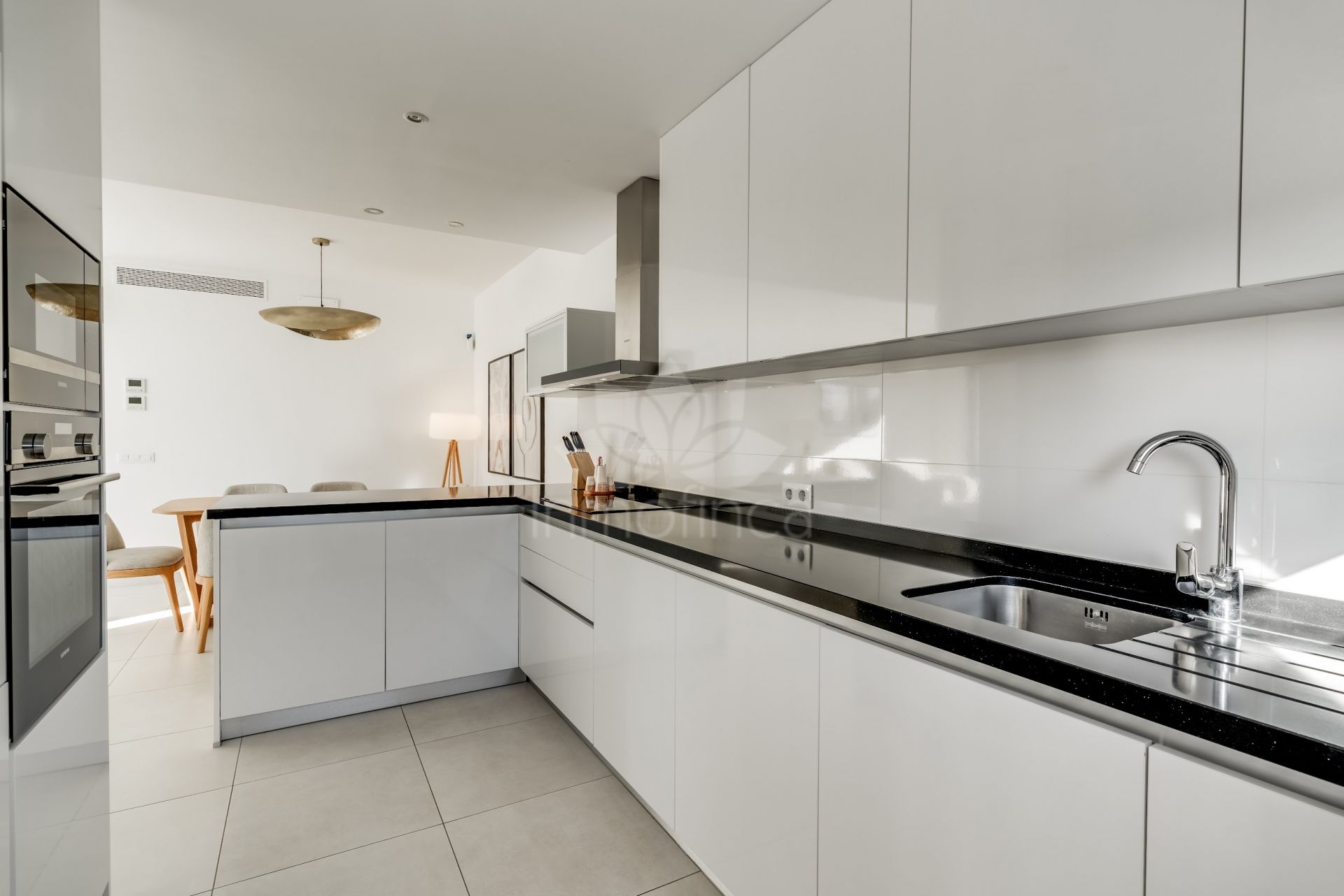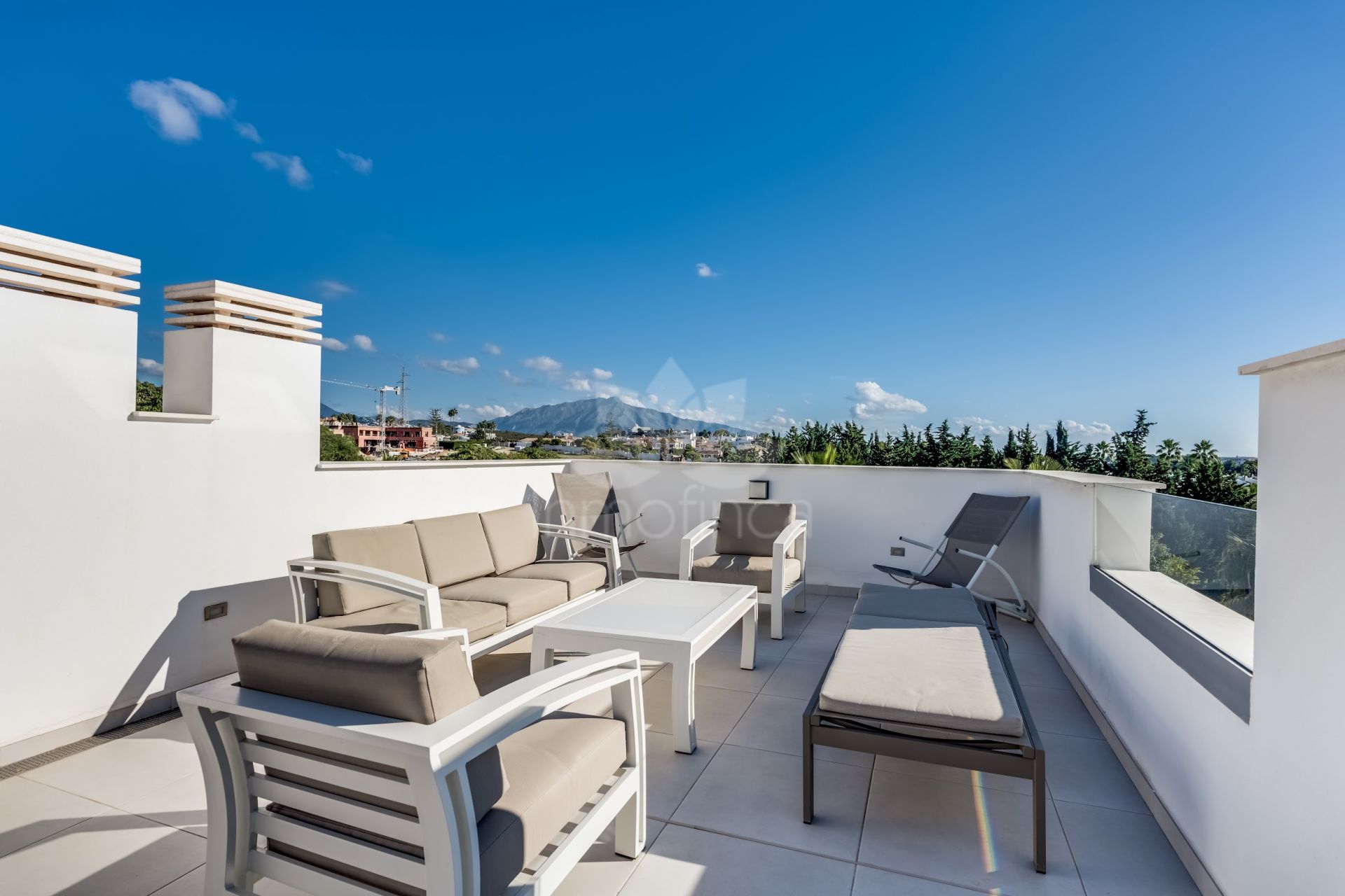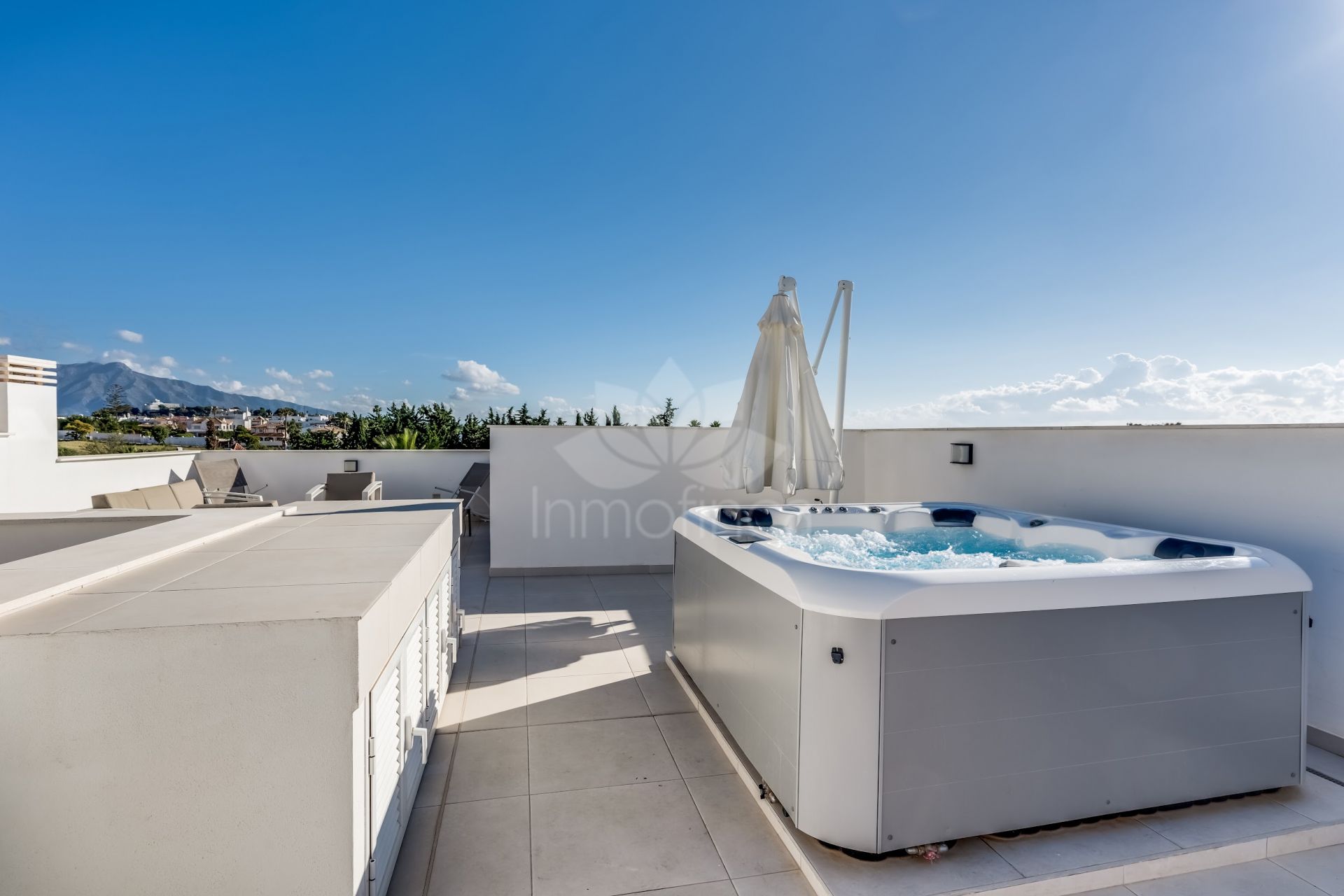Los Miradores del Sol es un desarrollo distintivo situado en la Nueva Milla de Oro. Esta propiedad contemporánea cuenta con cuatro dormitorios, tres baños y un área de comedor y sala de estar de planta abierta, con acceso directo a la piscina comunitaria y varias terrazas, incluyendo una amplia terraza en la azotea equipada con un área de barbacoa y jacuzzi.