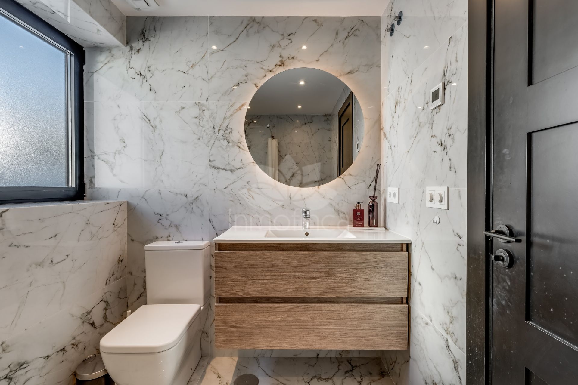 Nivel Superior: La suite principal ofrece un baño en suite y un diseño elegante, asegurando un retiro sereno y privado. Un dormitorio de invitados adicional con baño en suite también se encuentra en este nivel, ideal para familiares o invitados. Ambos dormitorios tienen balcones, permitiéndole disfrutar de las vistas y el clima mediterráneo. También hay una amplia terraza en este nivel.