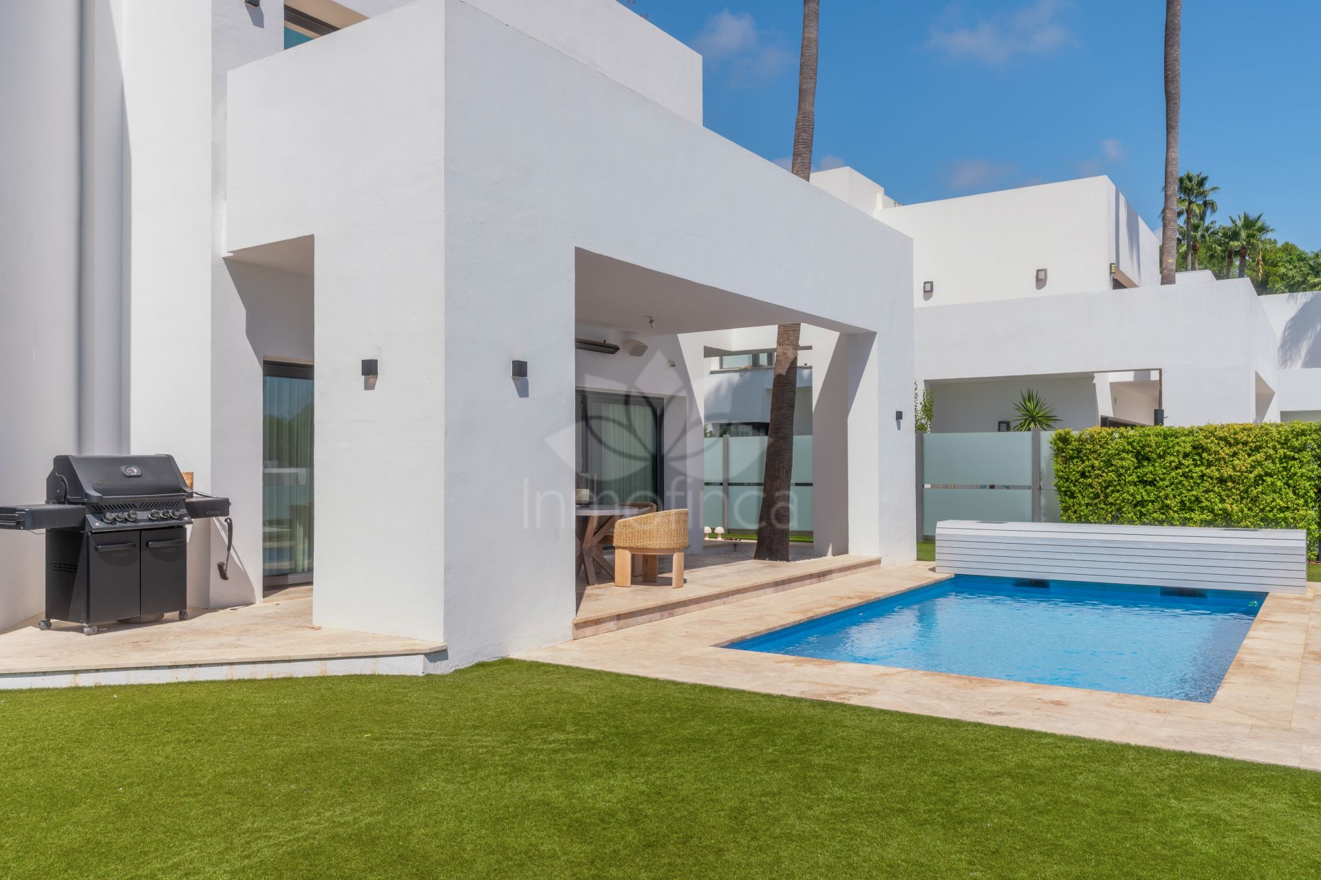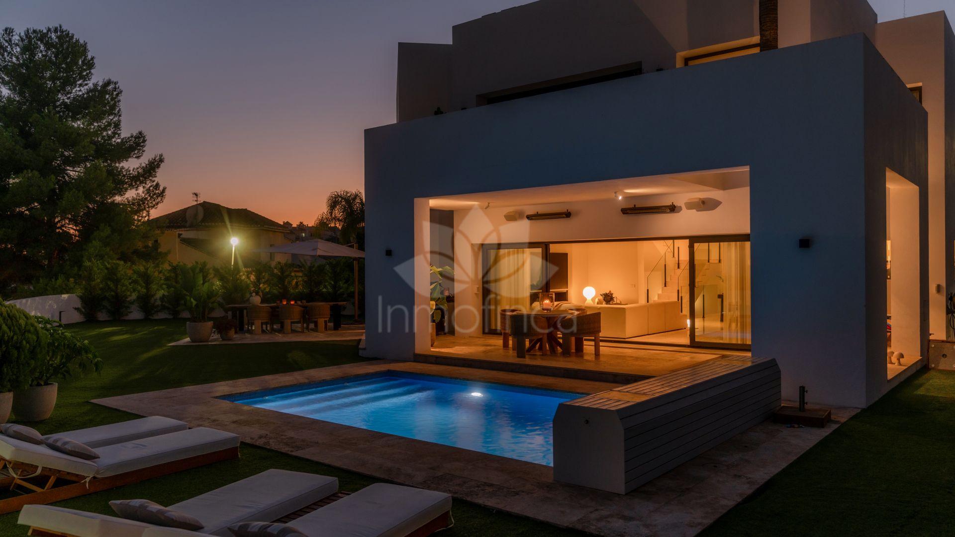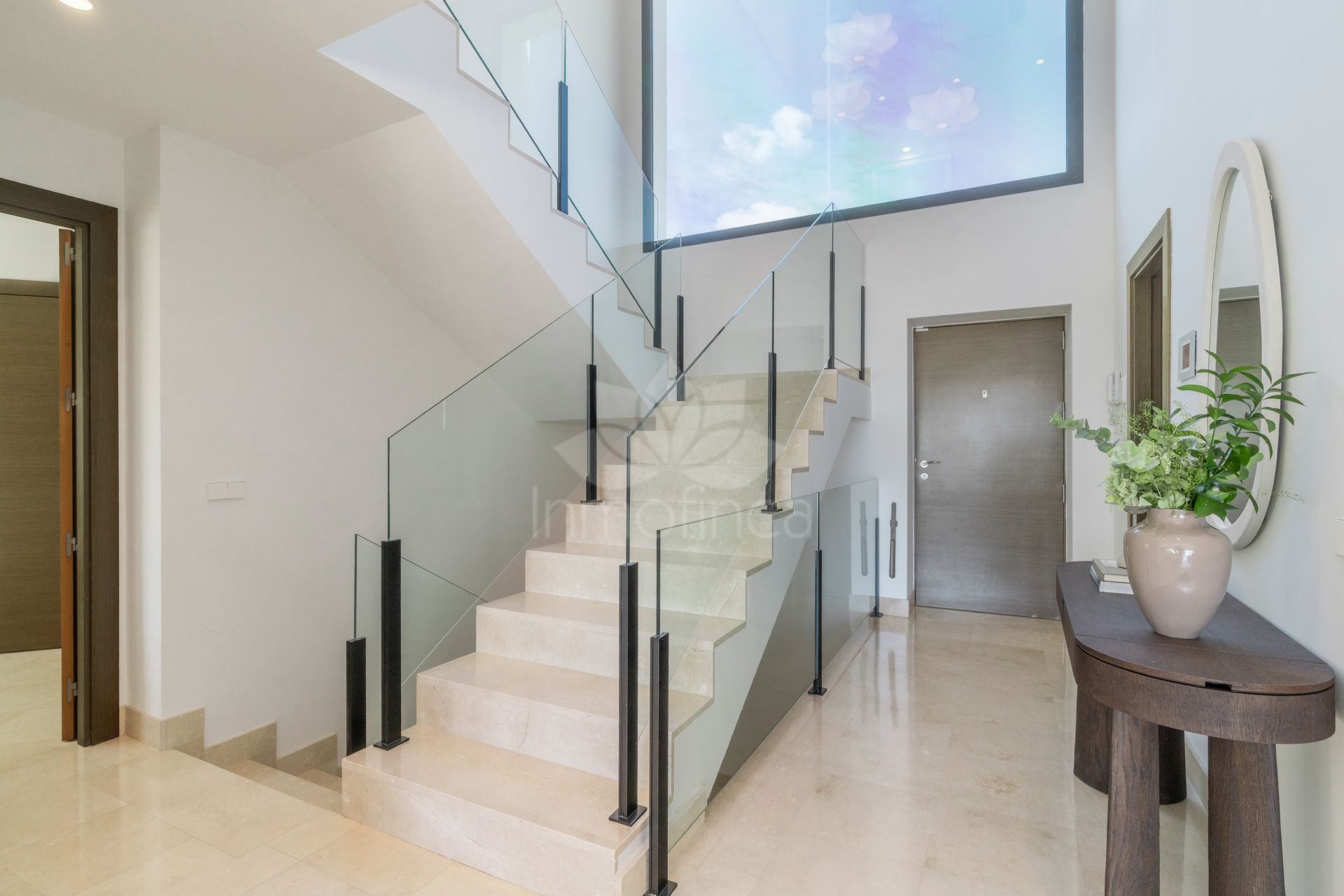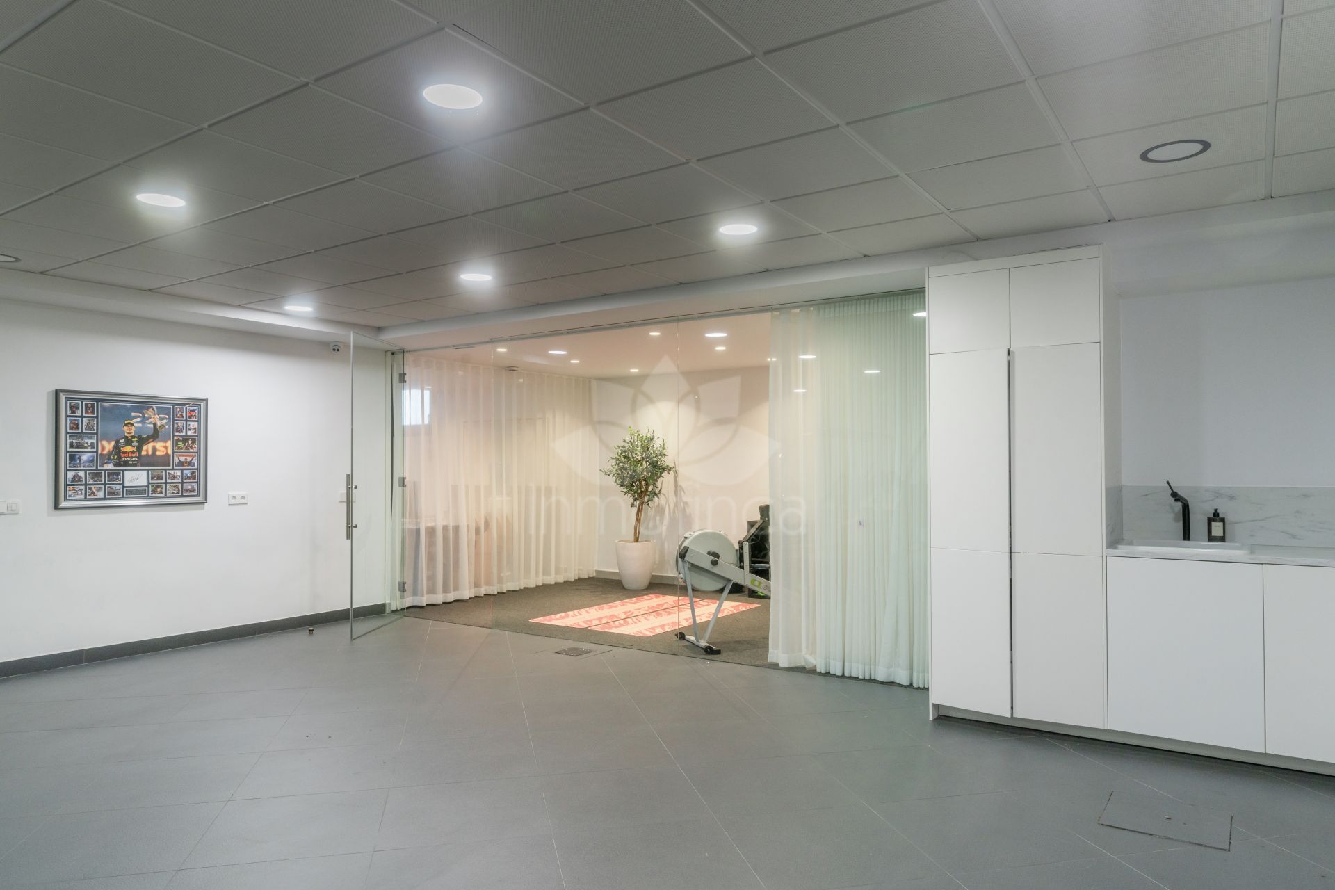 El interior se entrega completamente amueblado y cuenta con una cocina totalmente equipada, comedor y salón. Los ventanales de suelo a techo permiten la entrada de luz natural y enmarcan las vistas al jardín privado y la piscina. Un ascensor conecta todos los niveles, garantizando comodidad y accesibilidad, y el garaje tiene capacidad para hasta 4 coches.