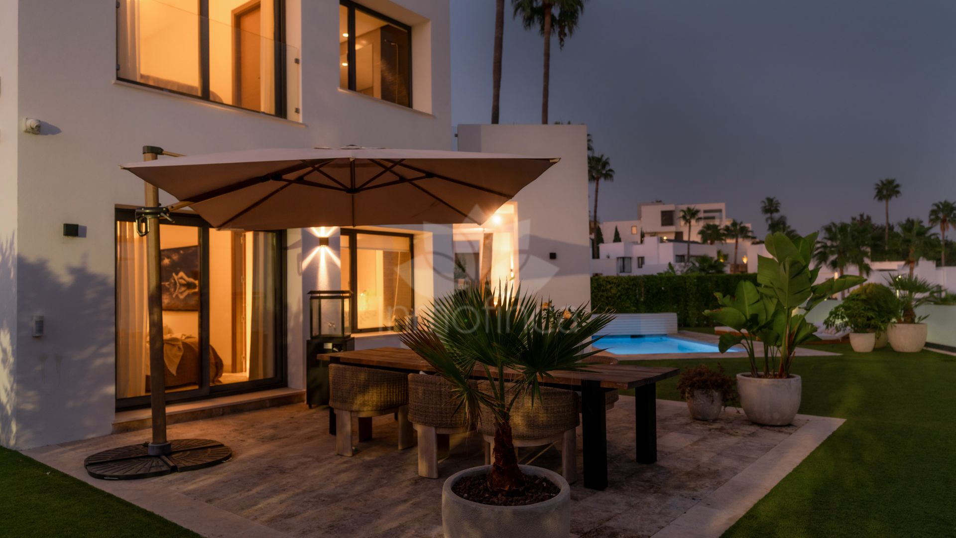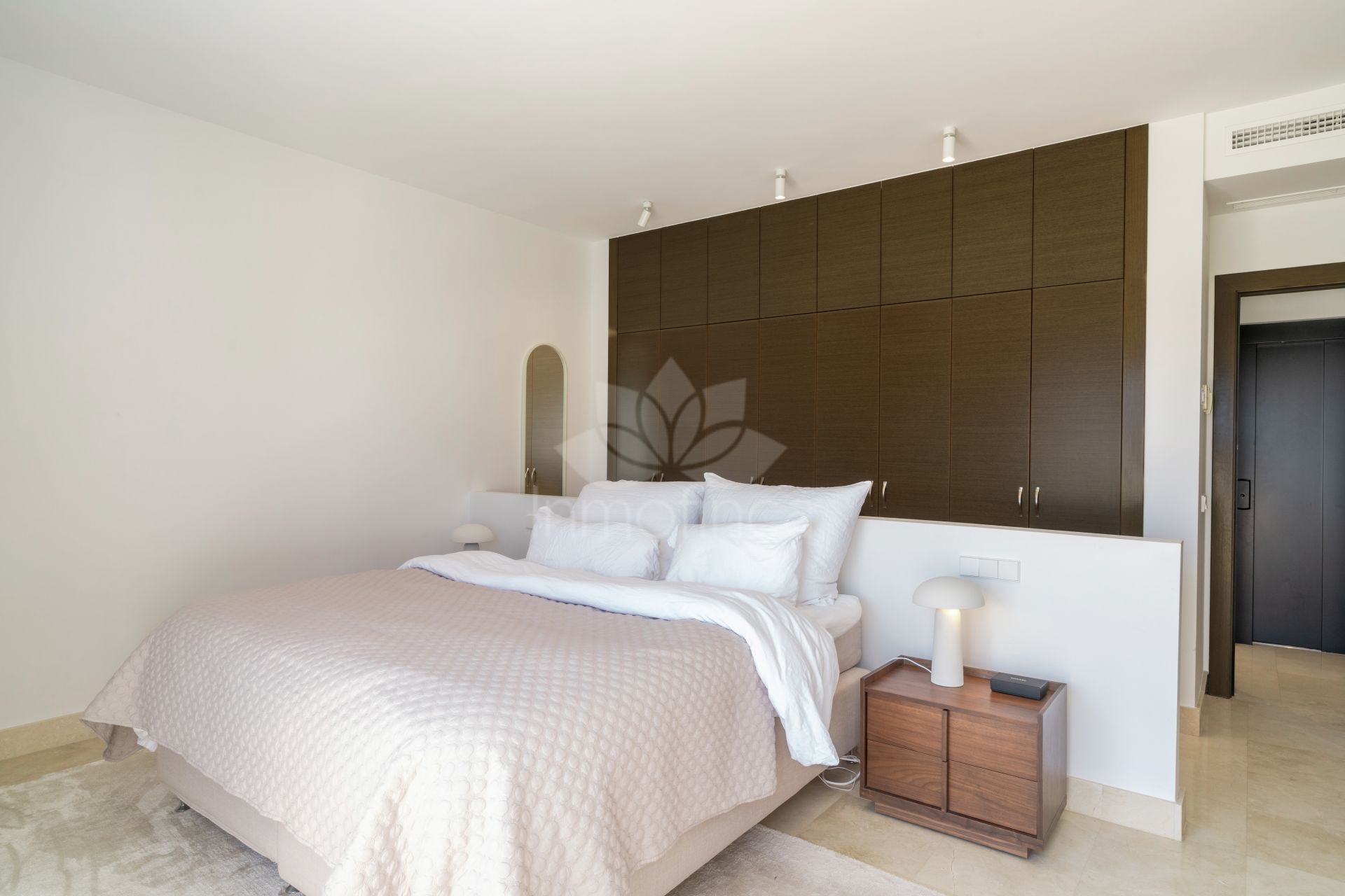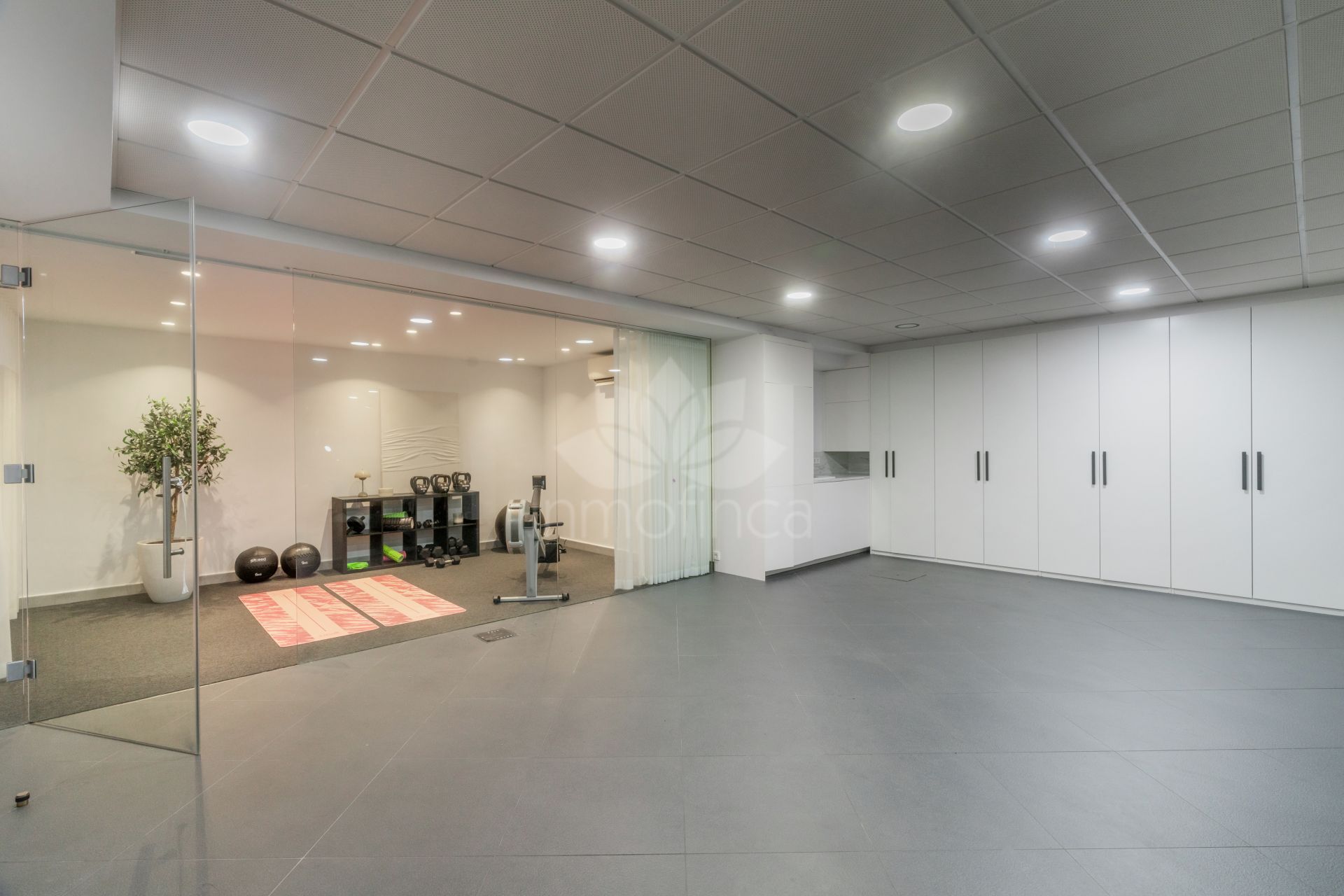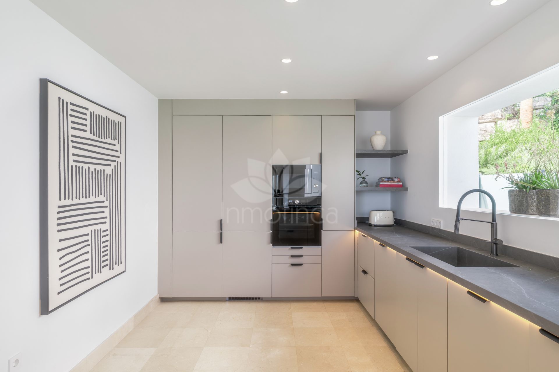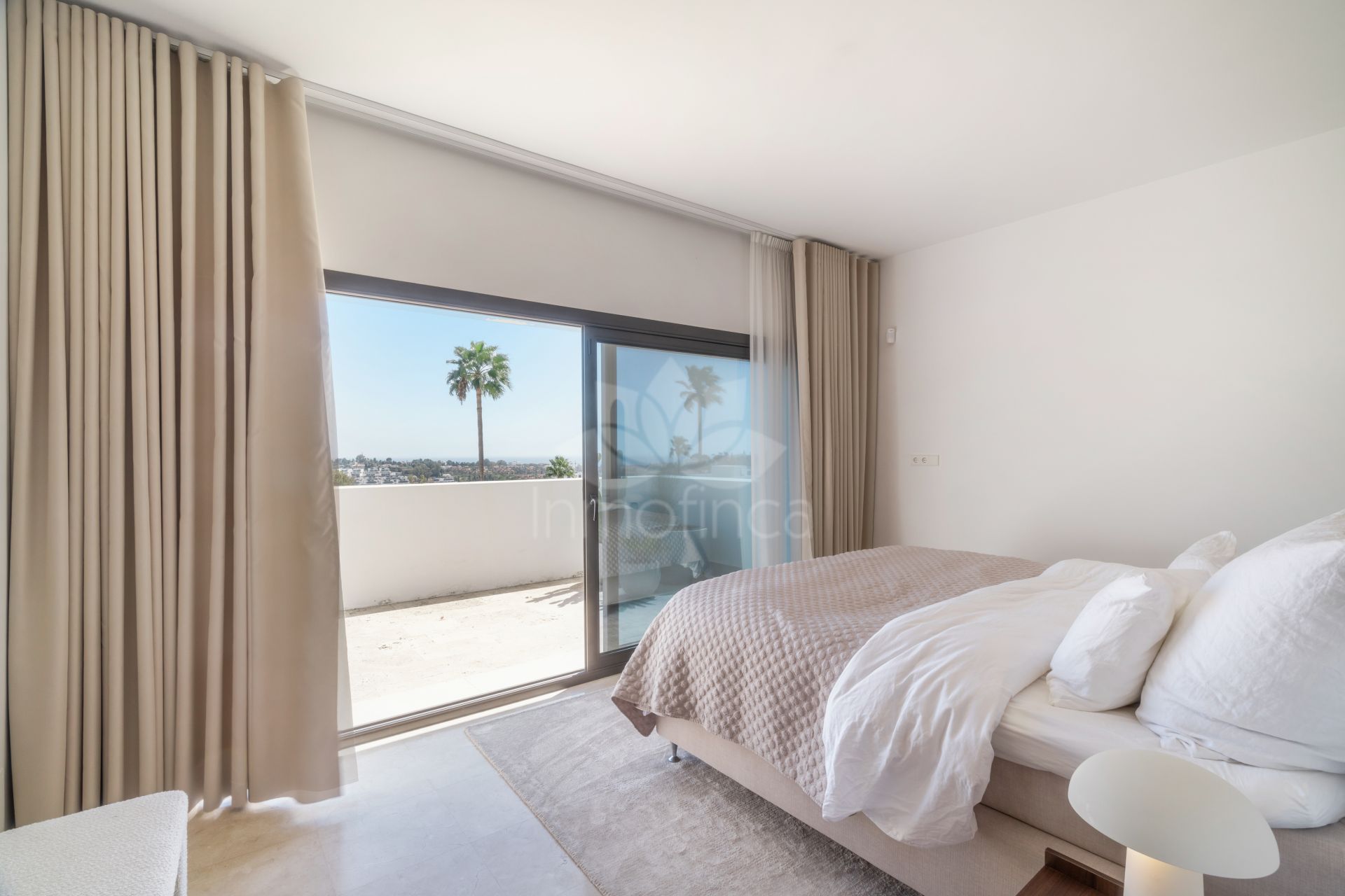 El interior se entrega completamente amueblado y cuenta con una cocina totalmente equipada, comedor y salón. Los ventanales de suelo a techo permiten la entrada de luz natural y enmarcan las vistas al jardín privado y la piscina. Un ascensor conecta todos los niveles, garantizando comodidad y accesibilidad, y el garaje tiene capacidad para hasta 4 coches.
