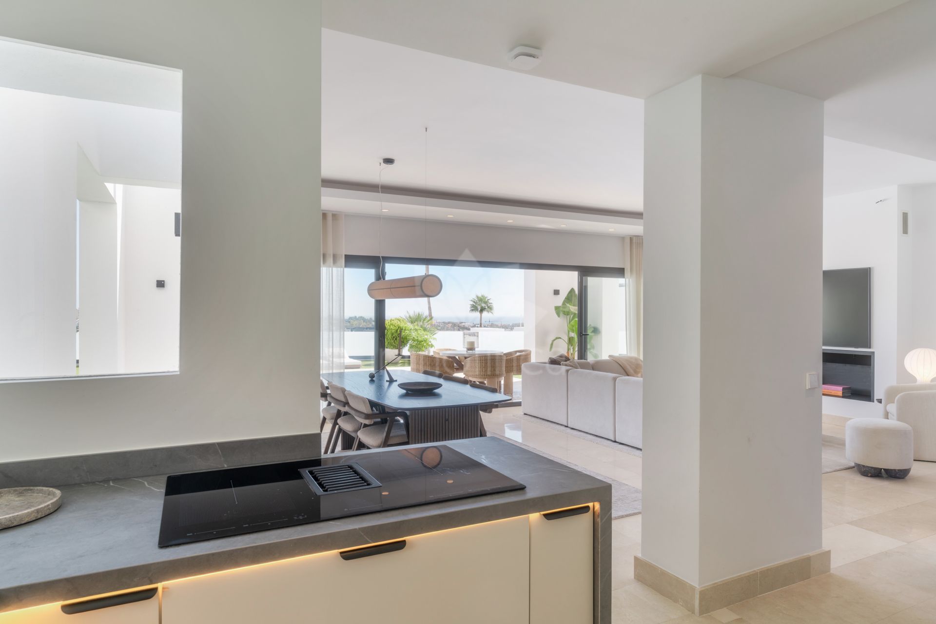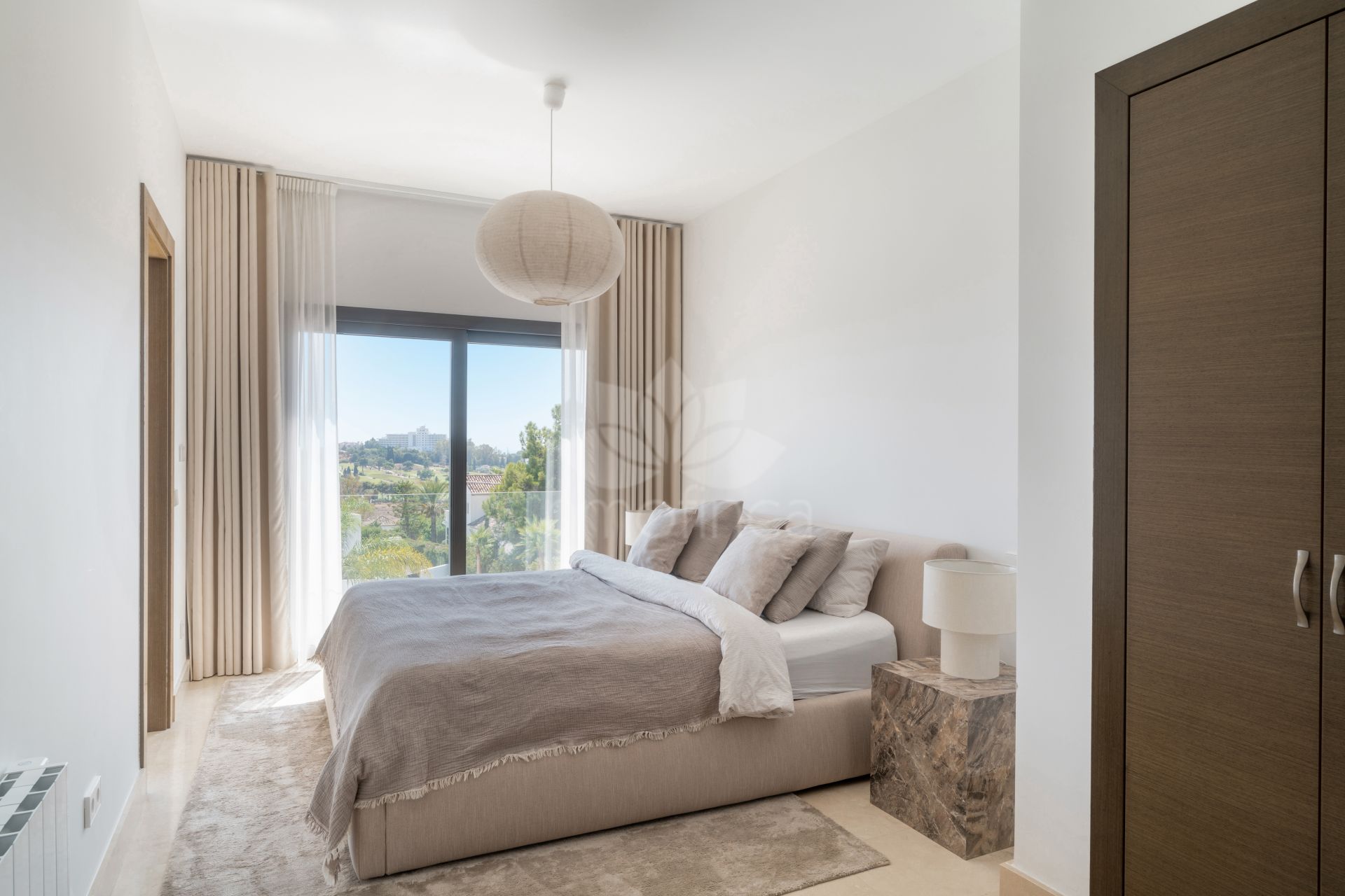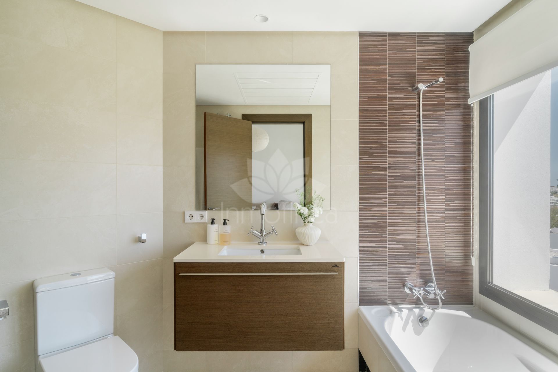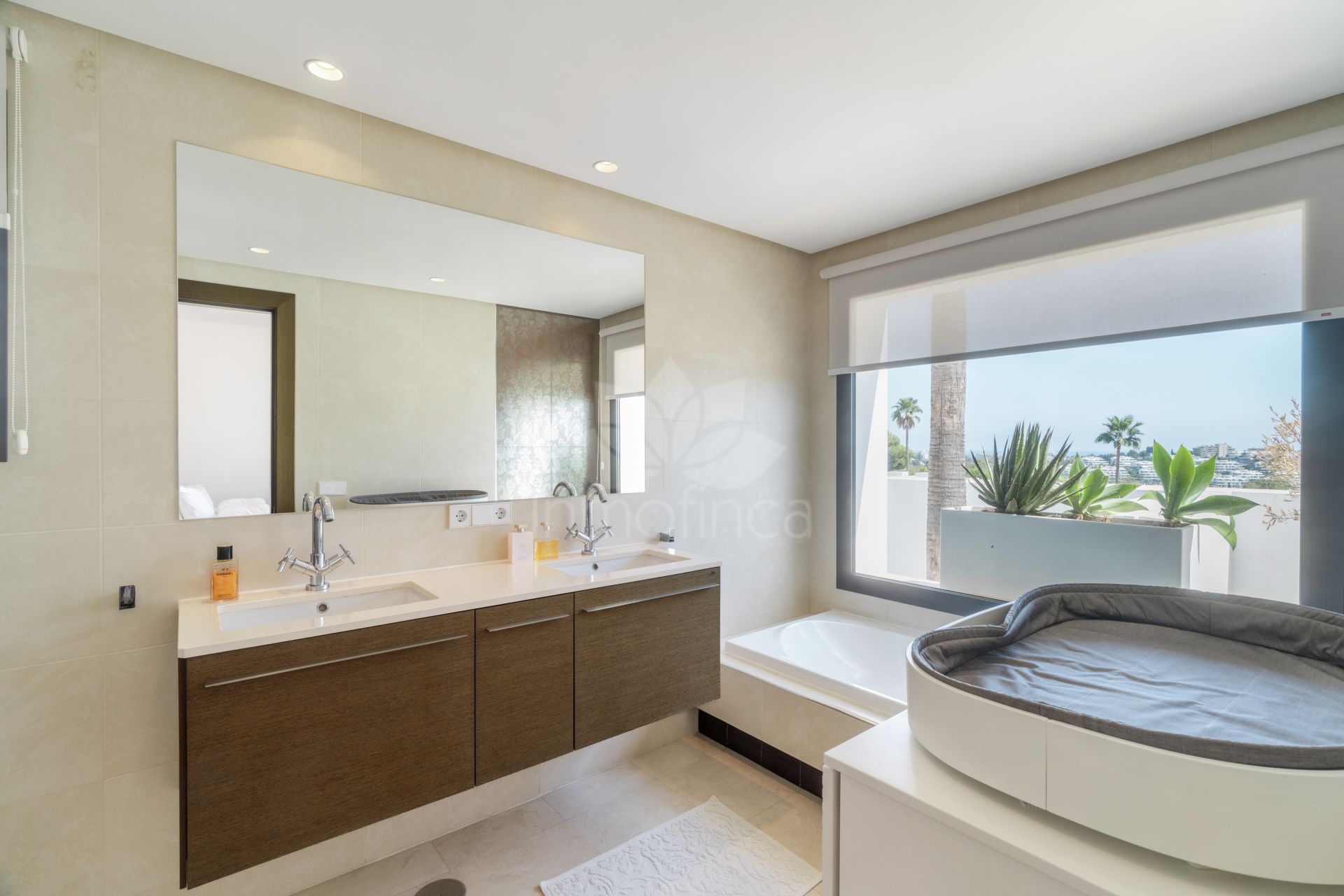 El interior se entrega completamente amueblado y cuenta con una cocina totalmente equipada, comedor y salón. Los ventanales de suelo a techo permiten la entrada de luz natural y enmarcan las vistas al jardín privado y la piscina. Un ascensor conecta todos los niveles, garantizando comodidad y accesibilidad, y el garaje tiene capacidad para hasta 4 coches.