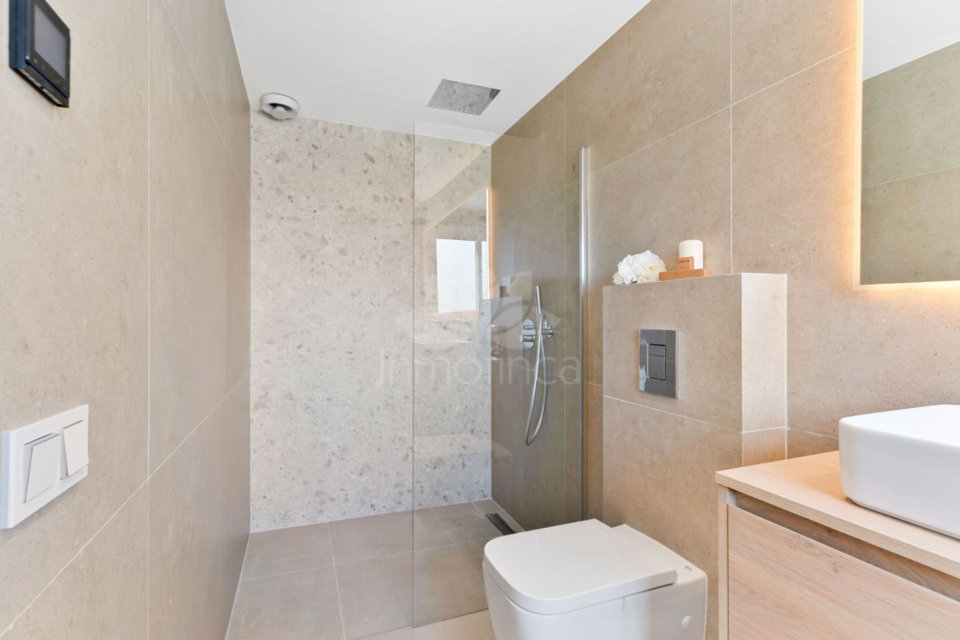 La planta superior presume de techos inclinados y un balcón adicional orientado al suroeste con vistas parciales al mar Mediterráneo. Actualmente, cuenta con dos habitaciones adicionales (ideales como dormitorios u oficinas), además de un elegante baño con ducha a ras de suelo.