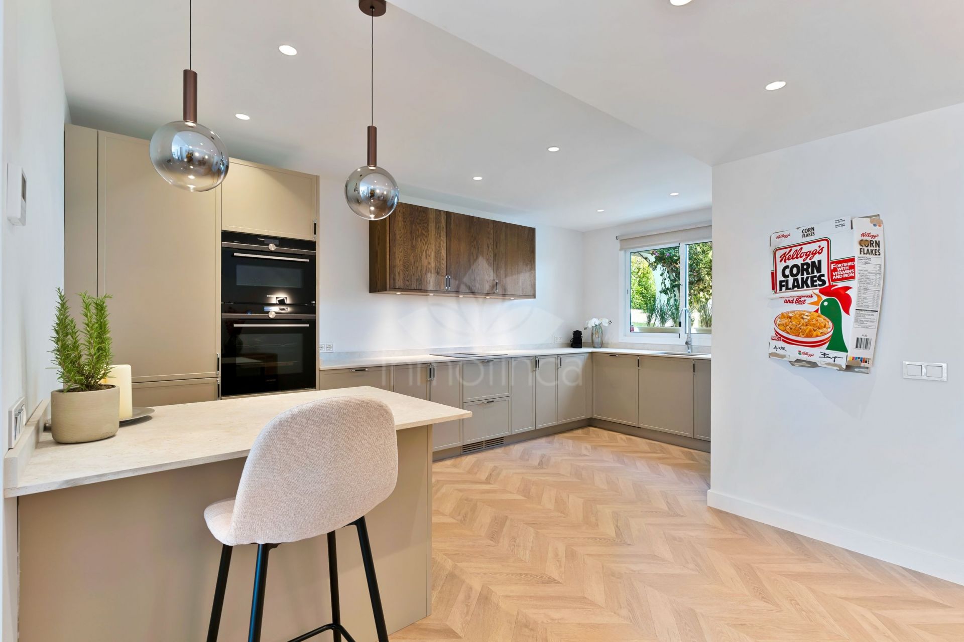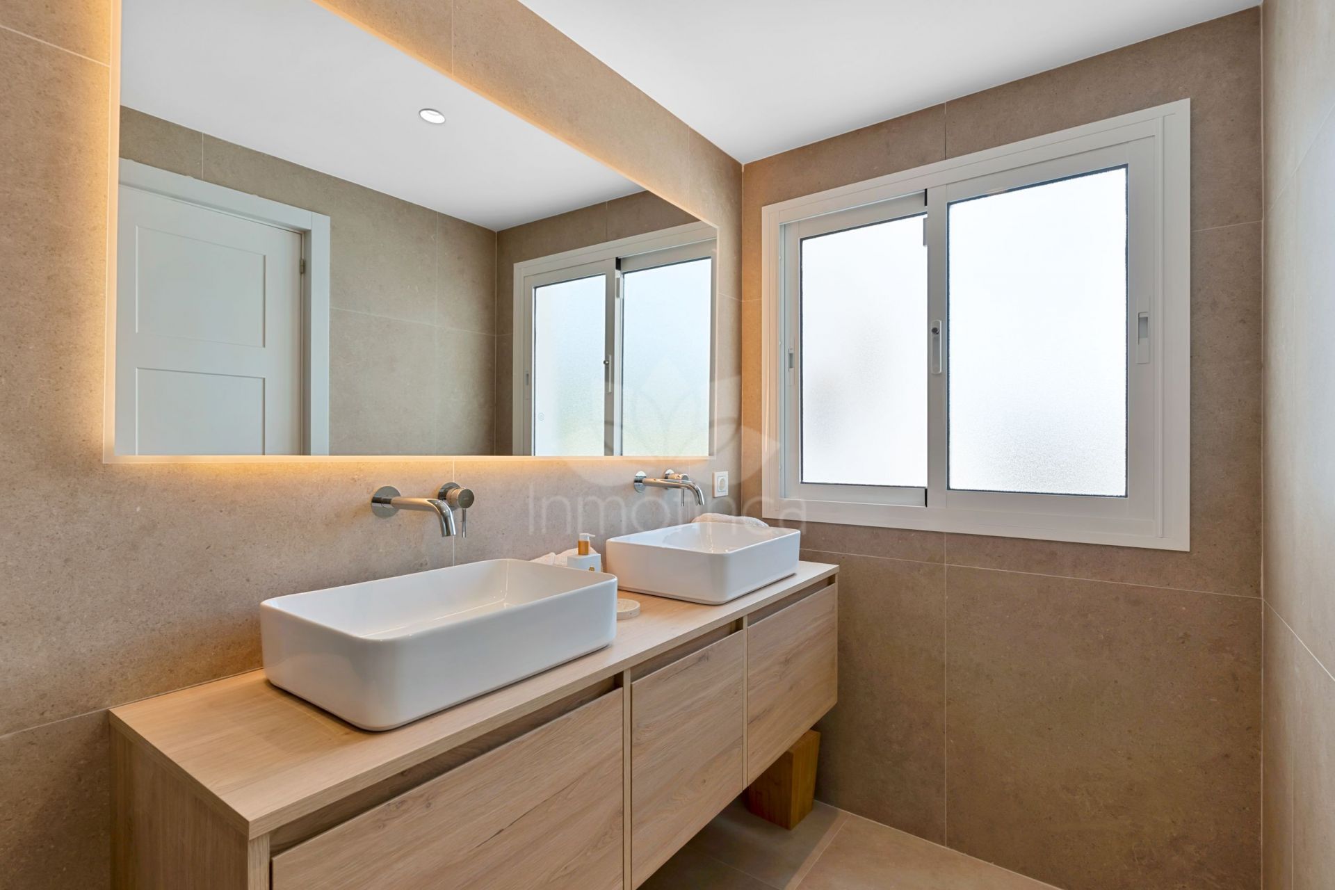 En el interior, la planta baja abarca casi 80 m² e incluye una elegante cocina de concepto abierto, un espacioso salón, vestíbulo de entrada y aseo de cortesía. El espacio está definido por principios de diseño escandinavo, con materiales modernos de alta calidad cuidadosamente seleccionados. Debajo de la escalera, hay una bodega personalizada. Todas las estancias cuentan con sistemas Airzone de control individual para calefacción y refrigeración, mientras que los baños disponen de suelo radiante. Las zonas húmedas están revestidas con azulejos de altura completa en un cálido tono beige.