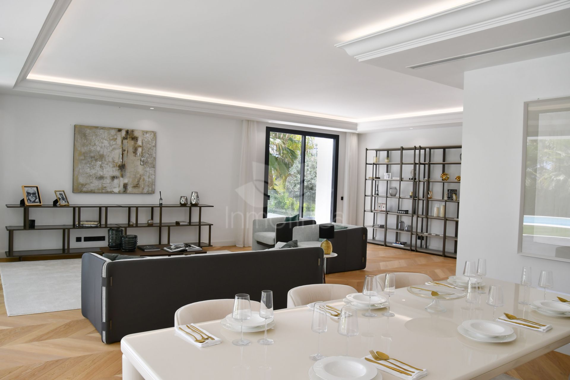 Al entrar a la villa, la planta principal ofrece un amplio espacio dividido en varias áreas. La cocina, totalmente equipada con electrodomésticos de última generación, cuenta con una isla hecha a medida.